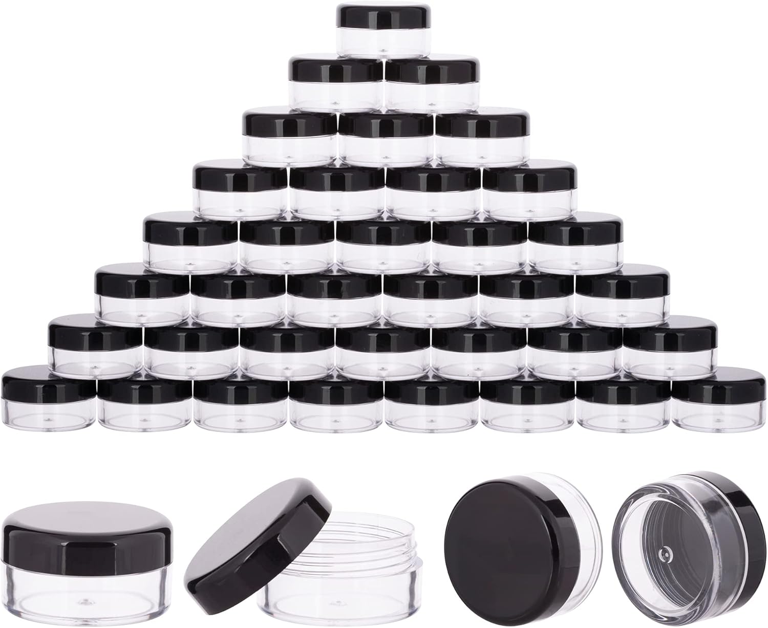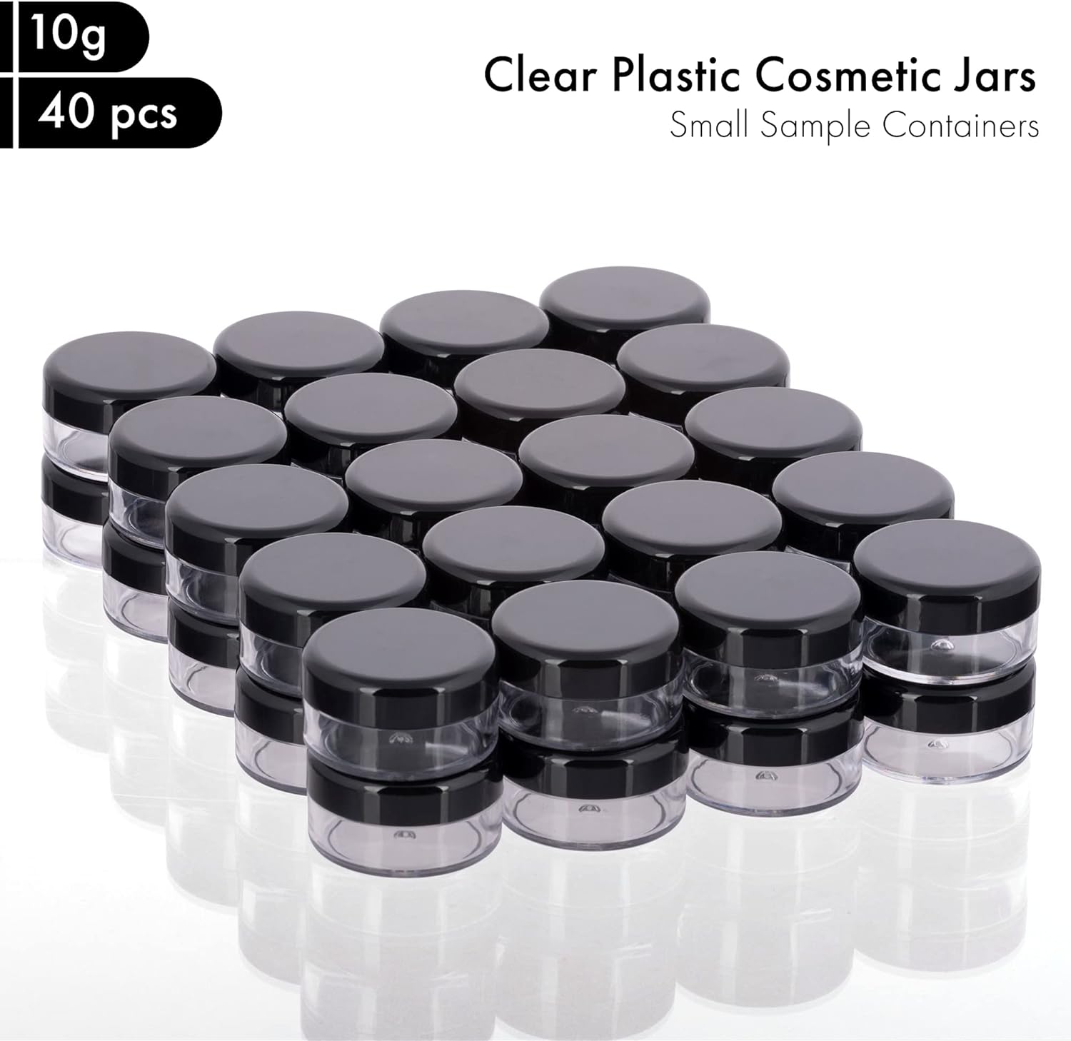 - Plastic Cosmetic Containers:40pcs x 10gram plastic jar containers. 6 Colors: Black lids, Clear lids, Pink lids, Blue lids, White lids, Green lids.