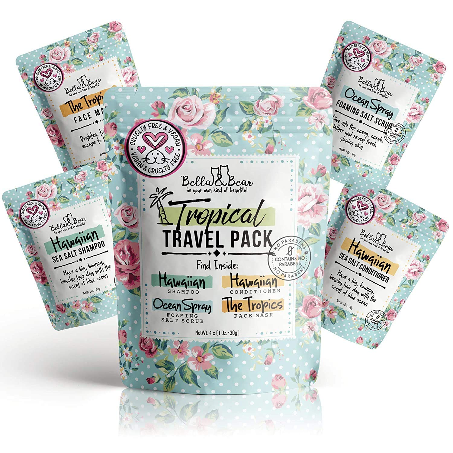 Bella & Bear Tropical Travel Pack, Self Care Kit, Includes Cruelty Free Shampoo, Conditioner, Body Scrub, Face Mask,1oz, Pack of 4