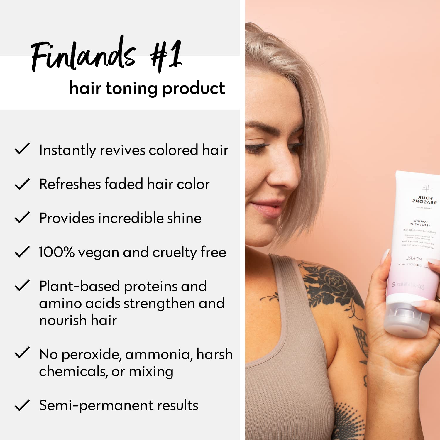 - REFRESH HAIR COLOR AND ELIMINATE YELLOW TONES: Use instead of a regular conditioner to maintain a cool blonde. Note that your hair’s porosity, condition and current shade affect the result’s evenness. Pair with Four Reasons Color Mask Pearl Shampoo for an even stronger toning effect.