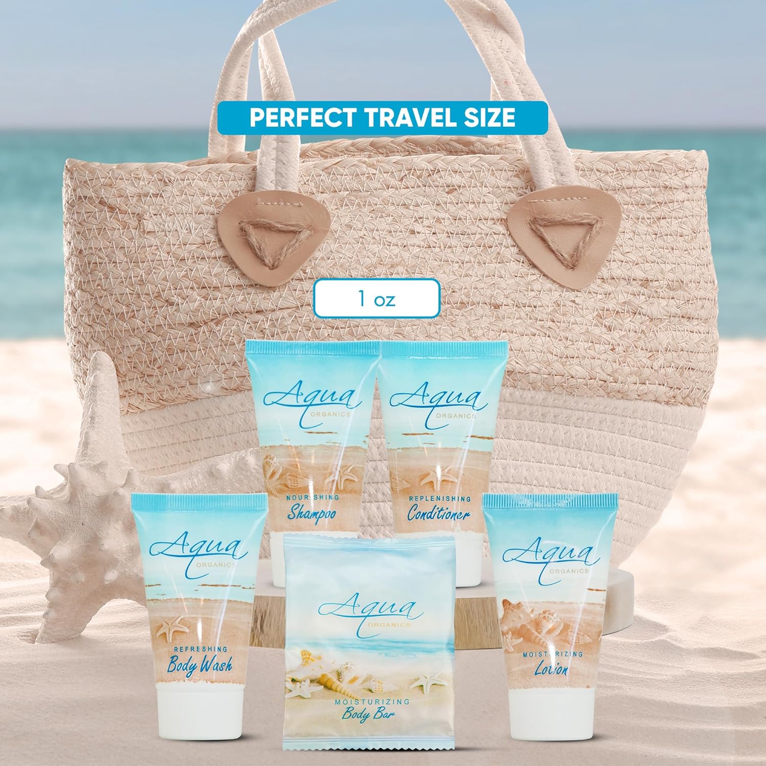 | Aqua Organics Hotel Soaps and Toiletries Bulk Set | Amenities for Hotels & Airbnb | 1oz Hotel Shampoo & Conditioner, Body Wash, Body Lotion & 1oz Bar Soap Travel Size | 5 Pieces