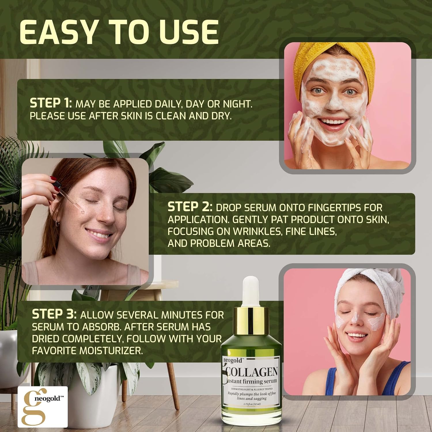 - EFFECTIVE INGREDIENTS β Neogold Collagen Serum is formulated with the perfect combination of effective anti aging + skin tightening ingredients, including Collagen, Peptides, Niacinamide, Glycerin, Hyaluronic Acid, Vitamin C, & Aloe Vera, which all deeply moisturize skin, improve elasticity, & help prevent moisture loss. Ideal for all skin types, this formula brims with clean, fast-acting vitamins & minerals that effectively help soften, firm, & lift skin for vibrant, supple features.