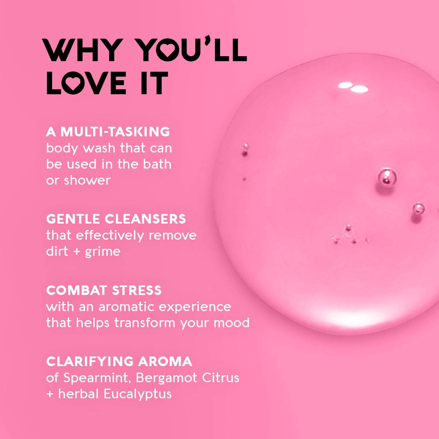 - Clear Your Mind: Breathe in the clarifying aroma of spearmint, bergamot citrus, and herbal eucalyptus; promotes a balanced and calming shower experience
