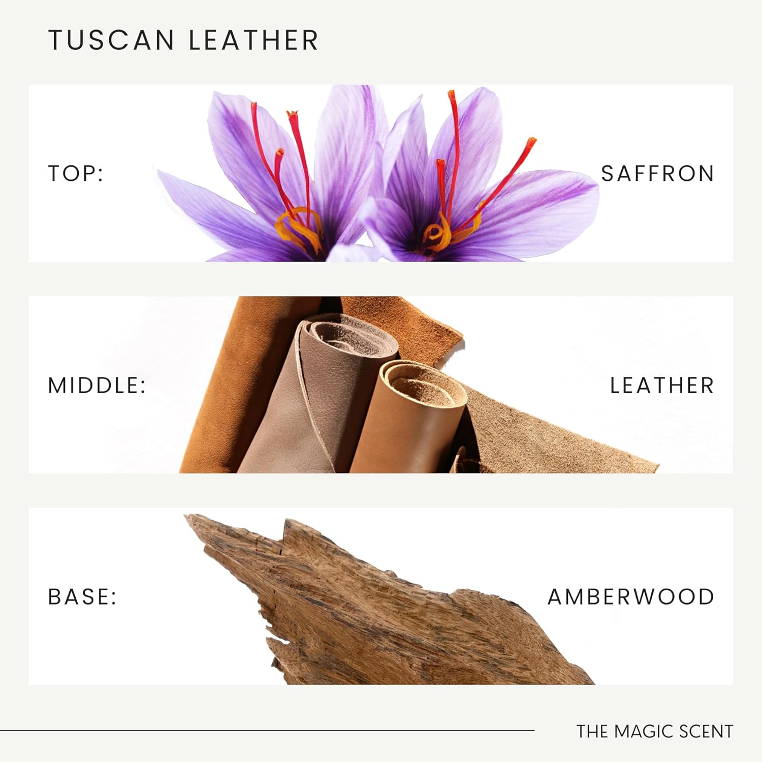 - SCENTED OILS FOR DIFFUSER OLFACTORY NOTES. Top Notes: Saffron, Thyme, Olibanum. Middle Notes: Leather, Black Suede. Base Notes: Amberwood, Thyme fragrance oil for diffuser.