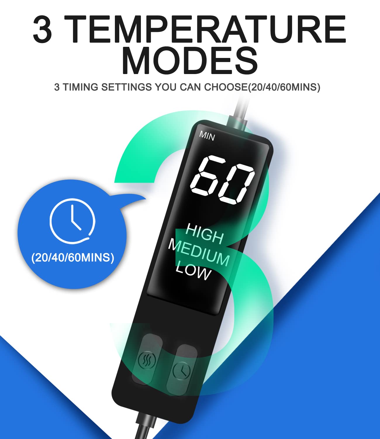 - The electrical heated eye mask was specially designed to have 3-class heat temperature settings from 104β to 140β and timing settings(20, 40 or 60 minutes). It will stop working automatically when time is up