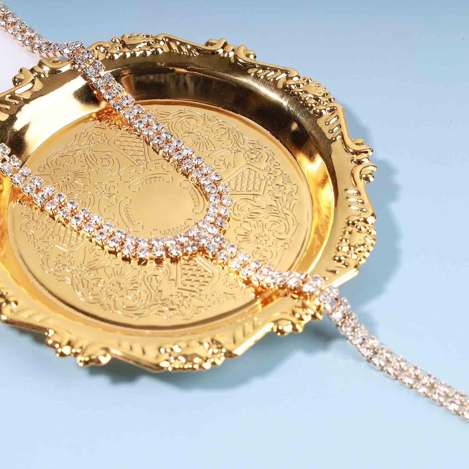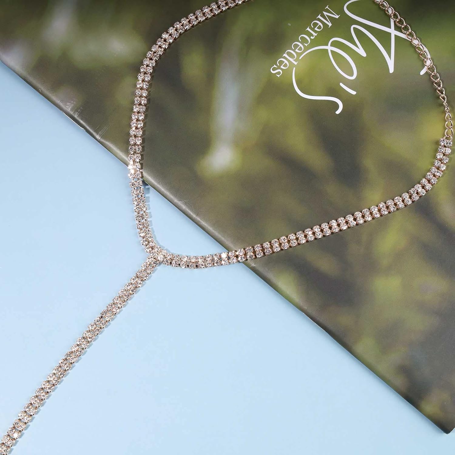 - Gold rhinestone chain y necklace with Real Images,in gold and silver,stay long and won't tarnish.
