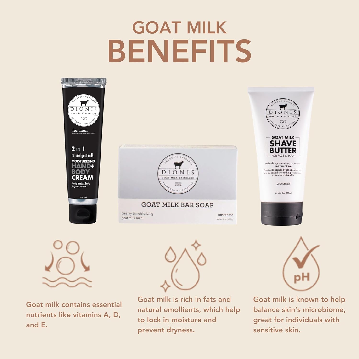 - Great For All Skin Types - Dionis products are dermatologist tested, cruelty free paraben free, gluten free, sulfate free, and made in the USA. For extra sensitive skin, try our unscented options. Feel good about feeling good with Dionis Goat Milk Skincare Products.