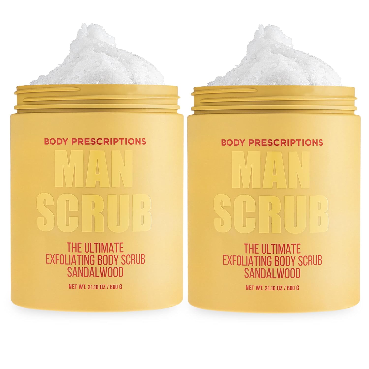 - RELAX + REFRESH: Delight your senses and relax at home with this 2 pack, 21.06 oz each ultimate exfoliating body scrub from body prescriptions. The “Man Scrub” comes in a largejar with an easy-to-use twist off top.