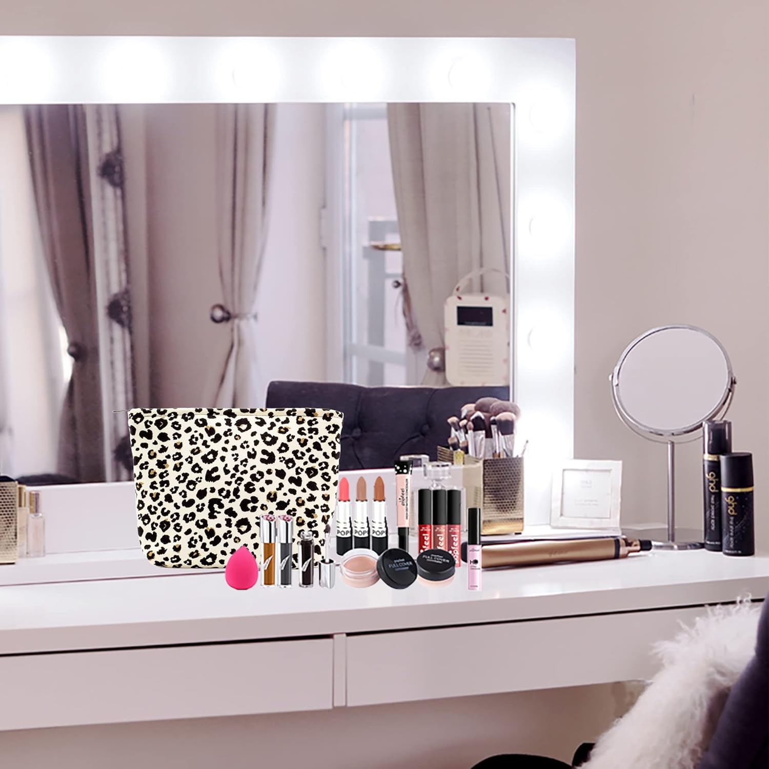 Makeup Bags for Purse Zipper Cosmetic Pouch Large Travel Canvas Make Up Organizer Tool Pouch for Women and Girls,Leopard Ivory