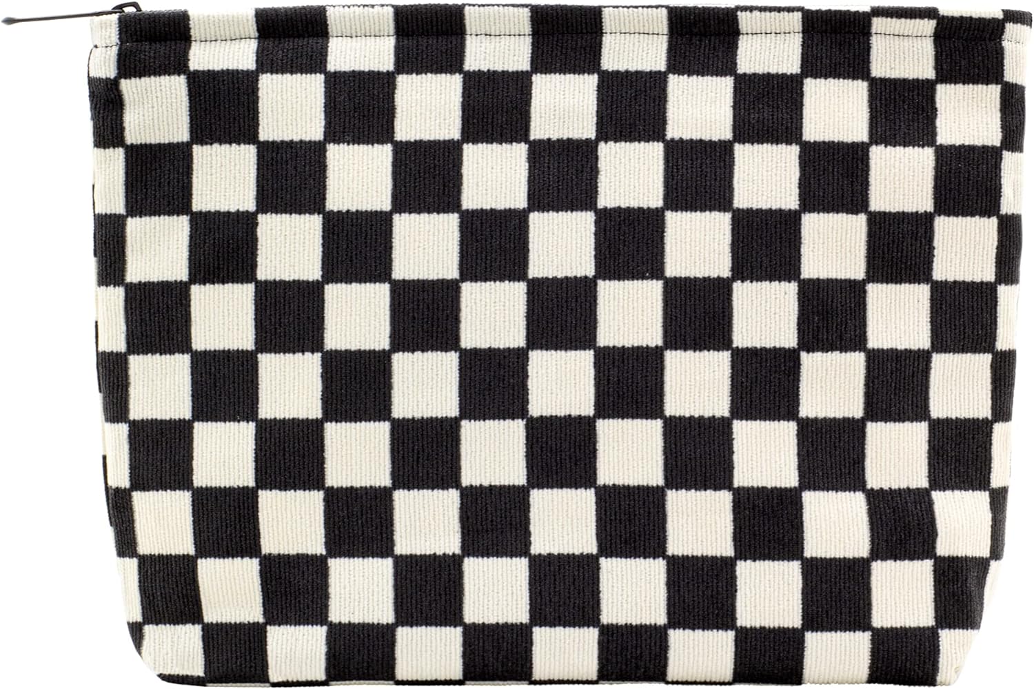 PAZIMIIK Makeup Bag Large Zipper Corduroy Make Up Pouch for Purse Travel Canvas Cosmetic Organizer for Women Brush Storage,Checkered Black
