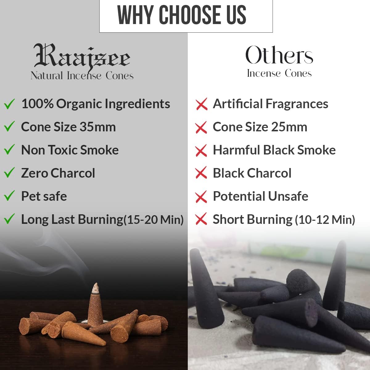 - NON-TOXIC CLEAN BURNING: : Raajsee natural insense cones have been made using a unique blend of essential oils, the finest combination of natural ingredients,herbs and natural wood incense powder to formulate a beautifully enhanced aroma throw. Our insencens cones contains a significant amount of pure essential oils and fragrances that work to fill the air with natural goodness and natural scents, release the best fragrances that are entirely free from toxins, artificial scents and harmful residues.