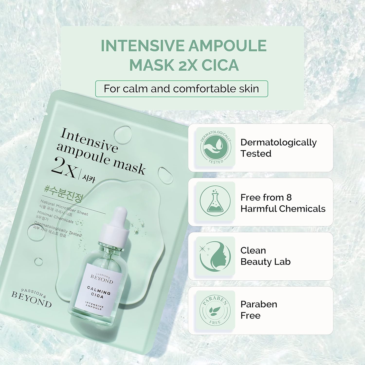 BEYOND Intensive Ampoule Mask 2X Cica with Centella Asiatica for Soothing/Moisturizing Care for Irritated and Sensitive Skin - Hypoallergenic Calming Facial Sheet Masks