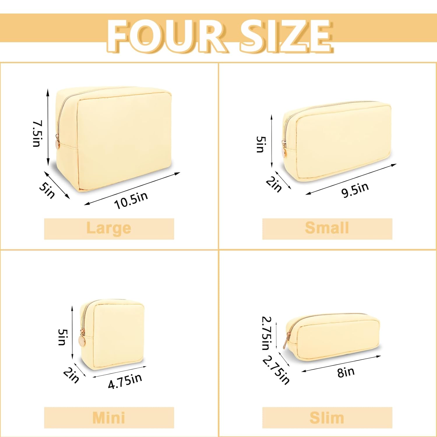 - 【Multiple Options】The cute makeup bag has four sizes, Mini(4.75''*2''*5''), Small(9.5''*2''*5''), Large(11''*5''*8'') and Slim(2.75*8''*2.75''). You can choose the right size according to the items you want to store. We have nine colors, Bubblegum, Sand, Chocolate, Periwinkle, Cotton Candy, Peach, Flamingo, Grape and Khaki. You can enjoy choosing the color you like.