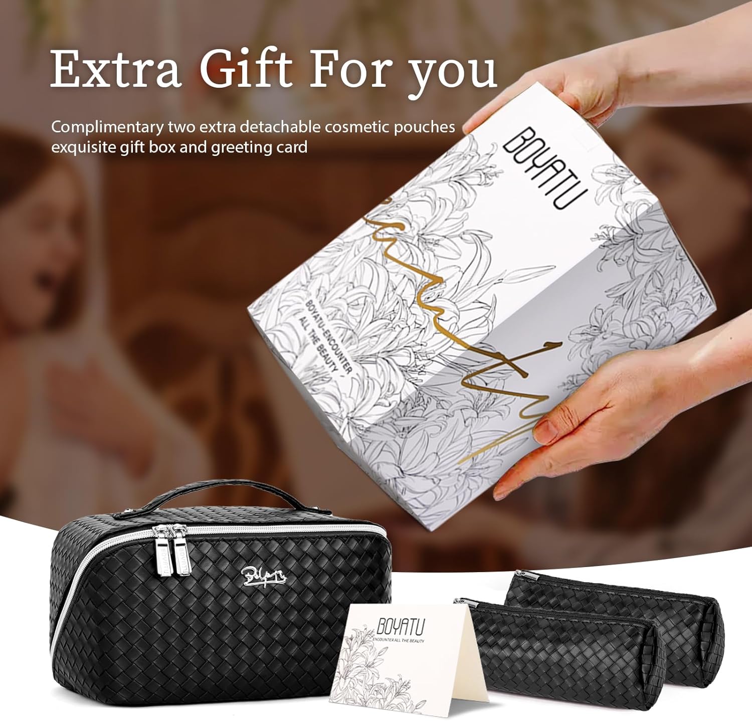 - Elegant Floral Makeup Organizer Bag: This women's cosmetic bag is made of high-quality PU leather, soft to the touch, waterproof and durable. Elegant appearance design will bring you countless awesome compliments. BOYATU portable travel cosmetic bag is a great choice and ideal companion for you.