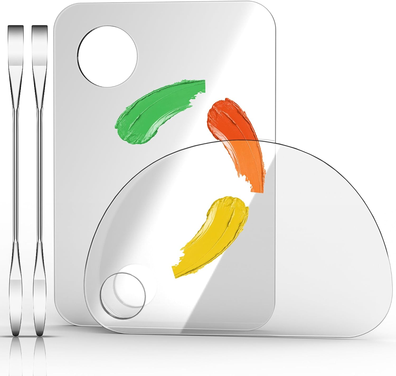 - 1【4 in 2 Set】2 sets of makeup mixing palette contains 2 acrylic makeup palette for foundation (6 * 4 inches) and 2 stainless steel makeup spatula (6 inches), individually packaged, super durable.
