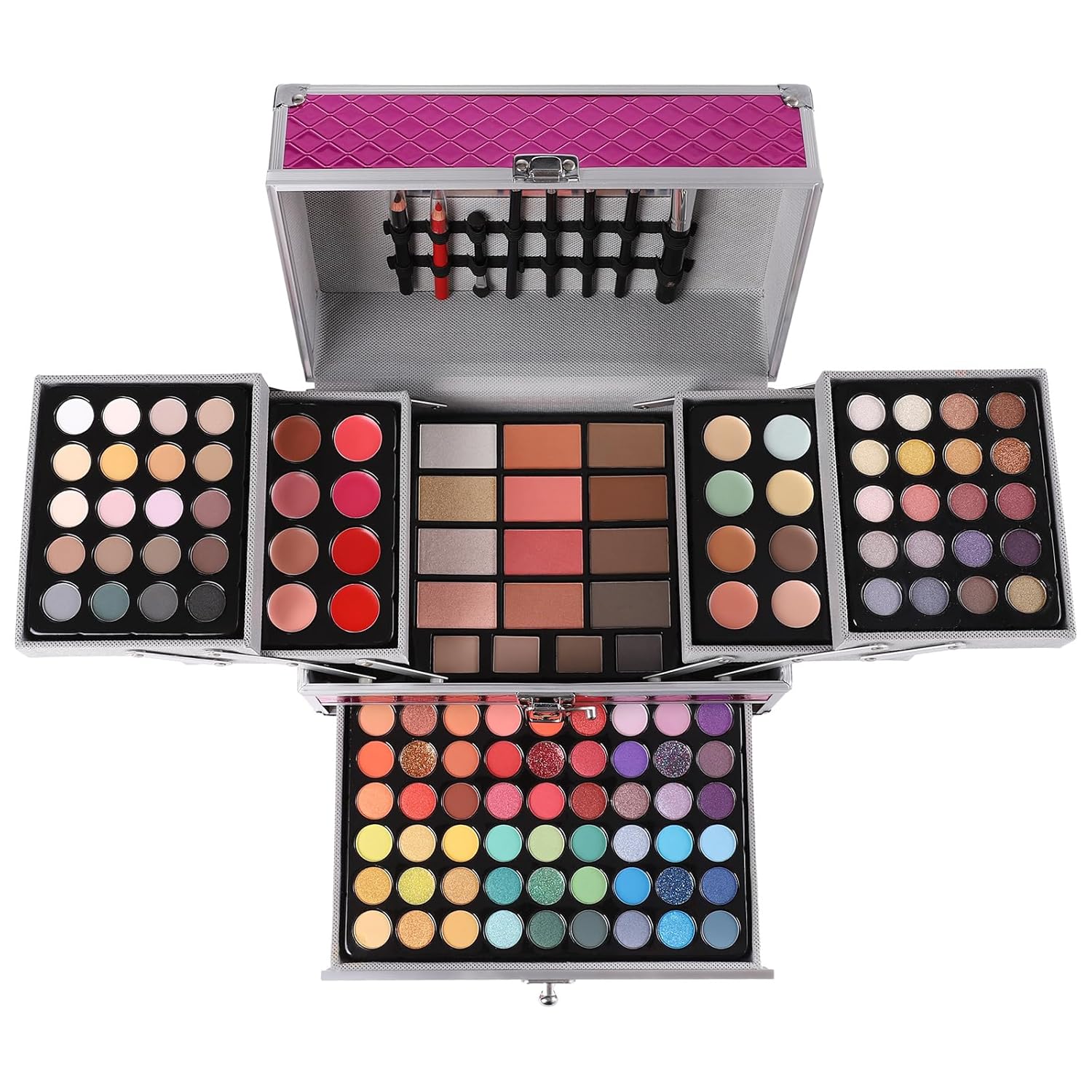 - Indulge in an opulent collection, comprising 94 Highly Pigmented Eyeshadows, 12 Luxurious Lipsticks, 12 Flaw-Concealing Concealers, 4 Brow-Defining Powders, 4 Blushes, 4 Highlighters, 4 Contours, 6 High-Performance Brushes, 1 Lash-Enhancing Mascara, 2 Precision Lip Liners, and 1 Defining Eye Liner.