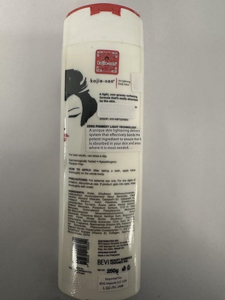 - Kojie San Body Lotion with Environmental Protection (250ml): New from Kojie San, this lotion is enriched with natural kojic acid. Now, combined with natural plant extracts & and environmental protection, it helps reduce uneven skin tone.