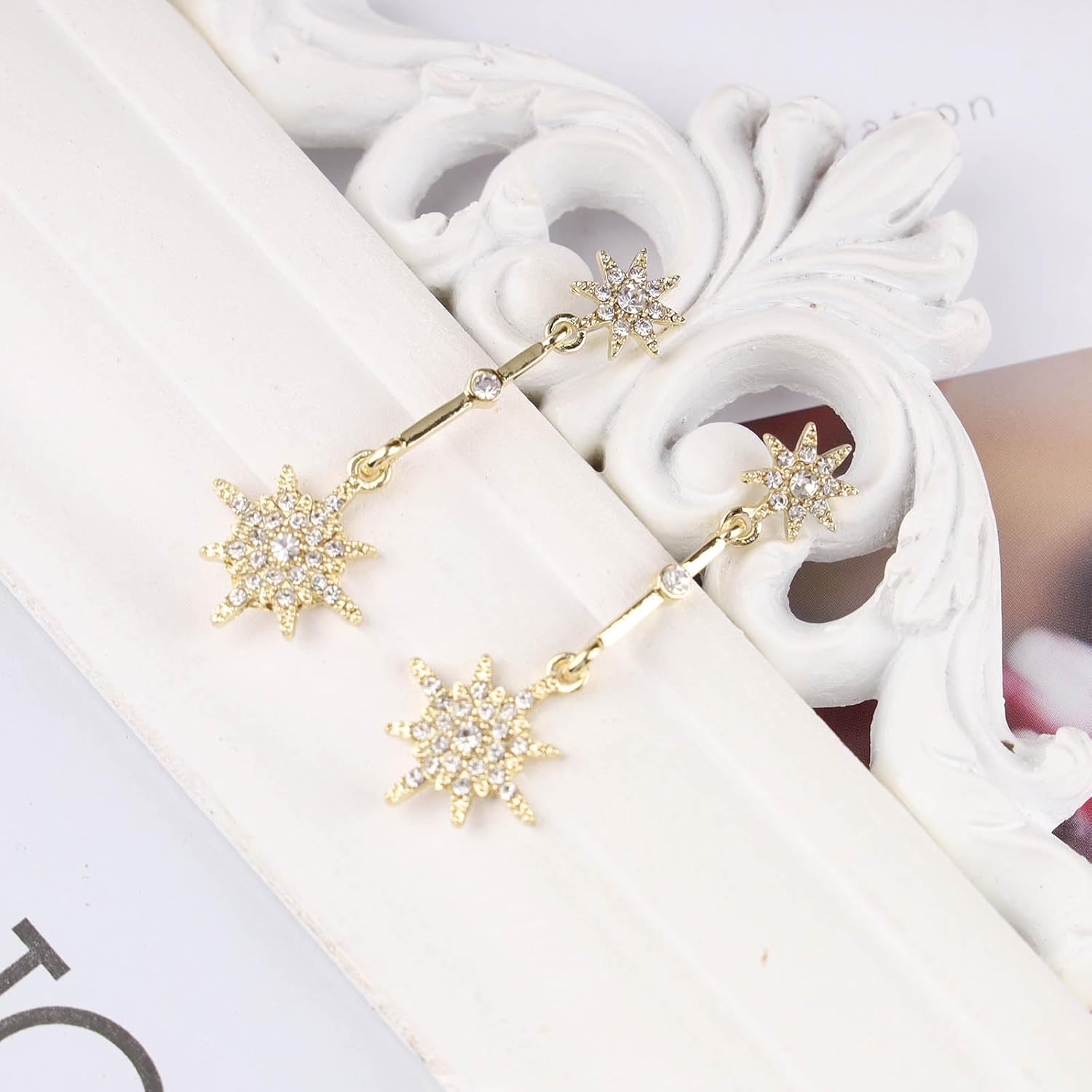 - Crystal northstar dangle earrings.Item Details:Handmade Item.Size:As Shown.Color:Gold.Materials:Quality Alloy/Crystal.Location:Ear.Style:Boho/Vintage.