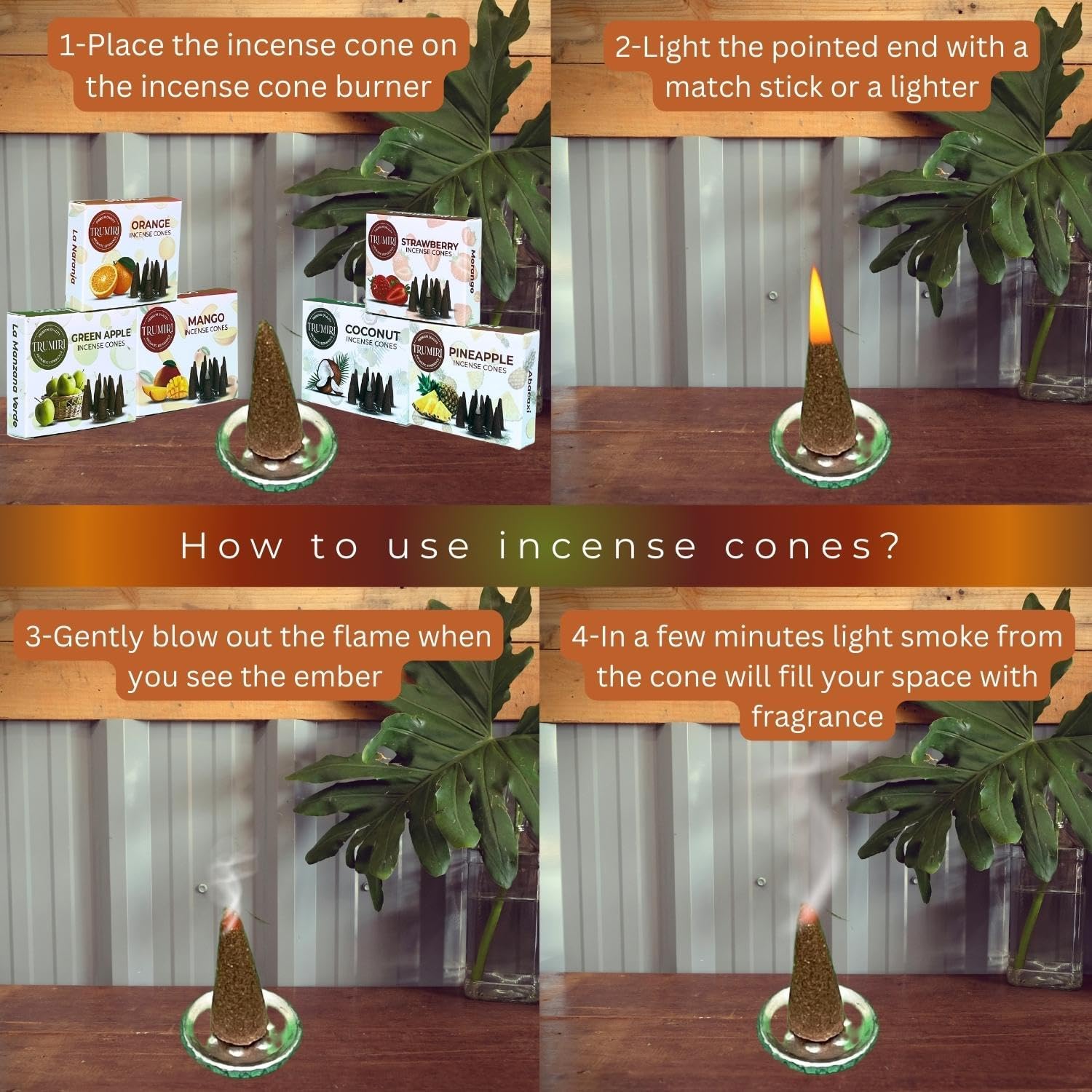 - Captivating Aromas - Immerse yourself in the delightful scents of our fruity incense cones, including Strawberry, Coconut, Pineapple, Apple, Mango, and Orange.