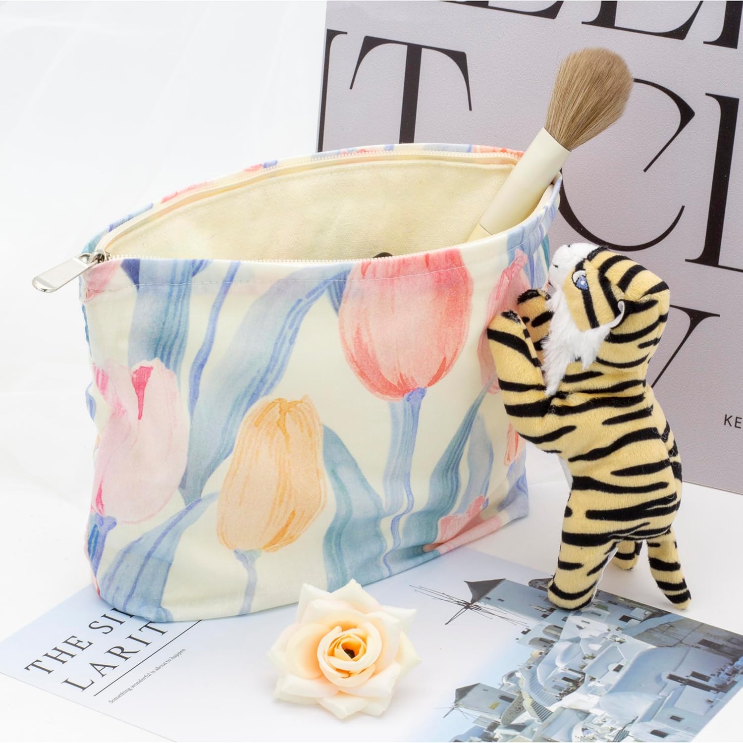 Floral Makeup Bag Large Cotton Zipper Pouch for Purse Travel Canvas Make Up Organizer for Women Cosmetic,Tulip Pink