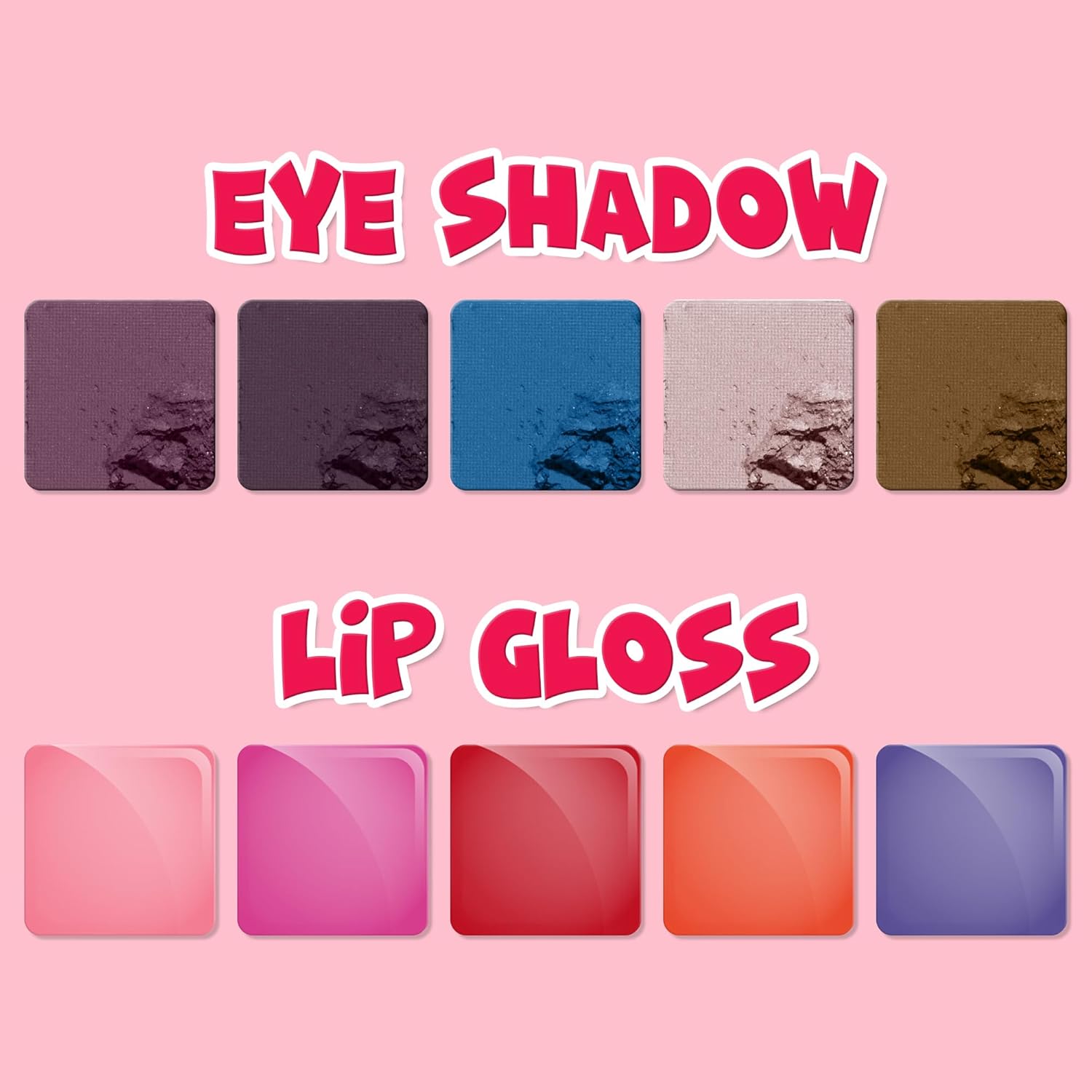 - KIT INCLUDES: 5-well eyeshadow of bright colors. 4 peelable, bubble gum scented nail polishes, 1 blush compact, 3 lip glosses scented in grape, cherry, and cotton candy, 1 cotton candy 5-well lip gloss, 2 roll-on lip glosses, flavored grape and cotton candy, 2 scrunchies, 1 hair bow, other hair accessories, 2 toe spacers, 1 nail and other nail accessories.