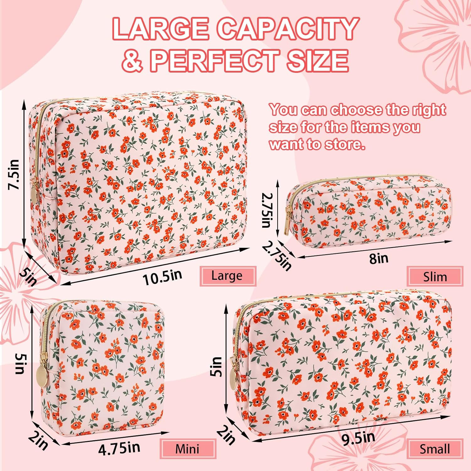 Waterproof Small Floral Makeup Bag Pouch for Purse,Nylon Flower Cosmetic Bag Preppy Travel Toiletry Storage Bag for Women Girl,Cute Makeup Organizer Bag Skincare Bag with Zipper(Small Pink-Flowers)