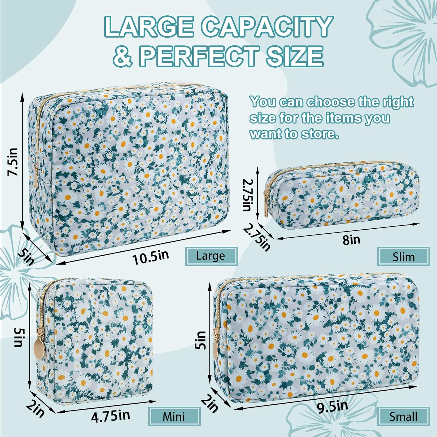 Waterproof Large Floral Makeup Pouch,Nylon Travel Toiletry Storage Purse Preppy Cosmetic Bag for Women Girl,Large Capacity Makeup Organizer Zipper Pouch for Work(L Green-Daisy)