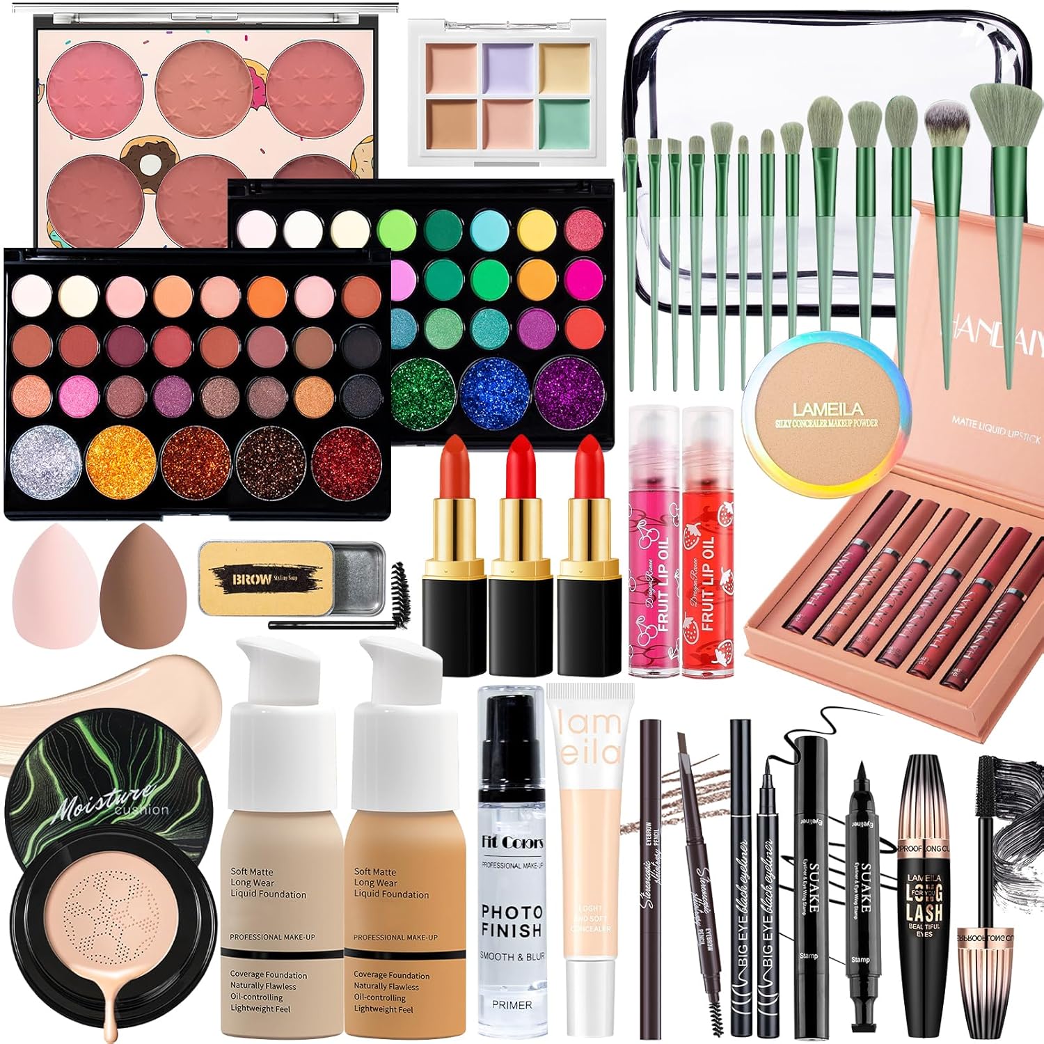 - [Makeup Set] The makeup present set for women includes natural mushroom head air cushion cc cream, full coverage natural & buff Beige foundation, face primer, 2 × 29 colors eyeshadow palette, liquid concealer, counter palette, blush palette, makeup setting powder, eyebrow soap, eyebrow pencil, eyeliner, winged eyeliner stamp, waterproof mascara, lipsticks, liquid lipsticks set, lip oil, makeup brush set, makeup sponges, cosmetic bag.