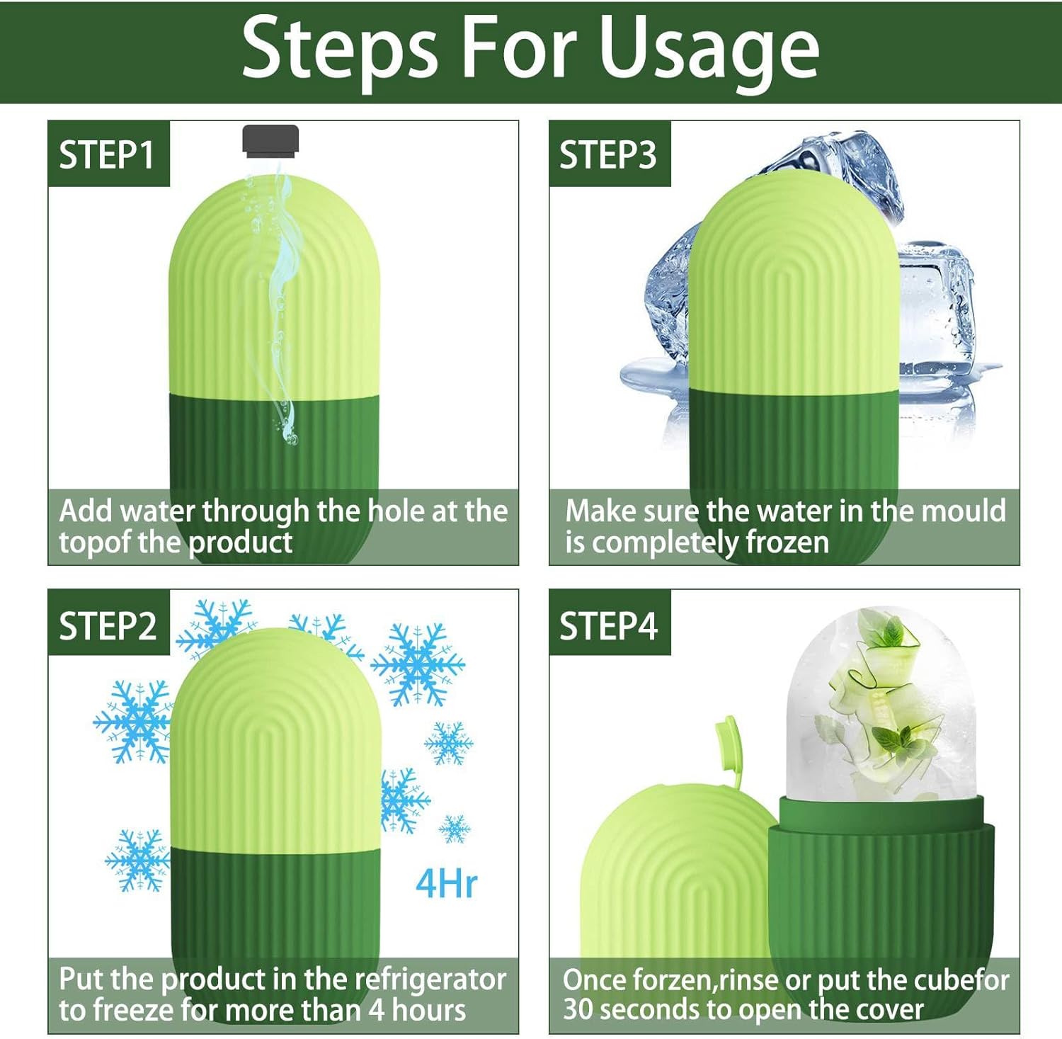 - 💞【Easy to use】 EASY TO USE: Fill the ice roller massager mold with water. Freeze in refrigerator for more than 4 hours,when using it apply the ice to your skin in 30 second intervals in circular motions. For optimal results, It is recommended to use 1 or 2 times a day