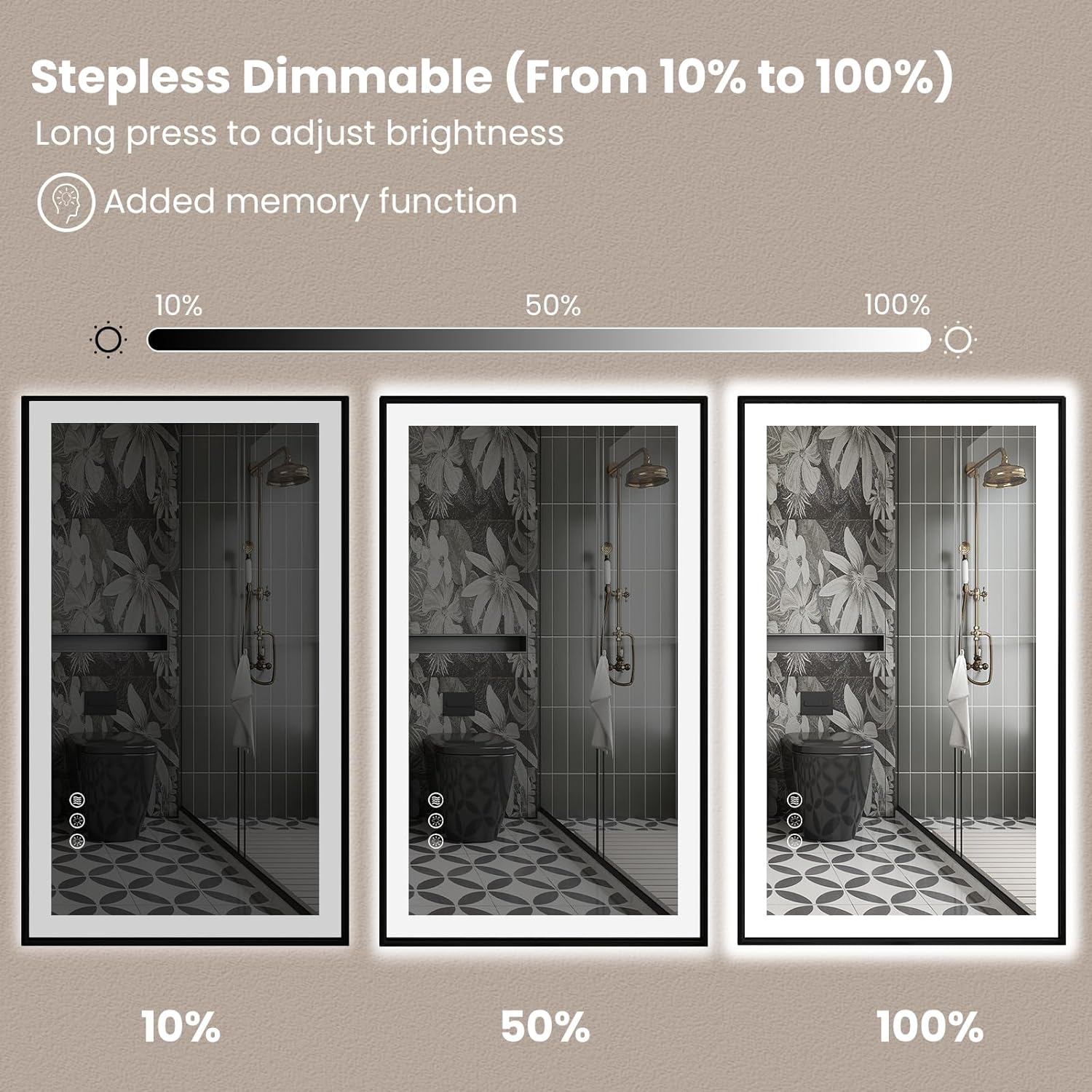 - [Anti-fog]: After a few minutes of opening the defogger, the heater in the mirror will disperse the fog from the center to sides, the mirror will still reflect clearly in the bathroom surrounded by hot air; It will turn on with the power on and automatically turns off after 1 hour