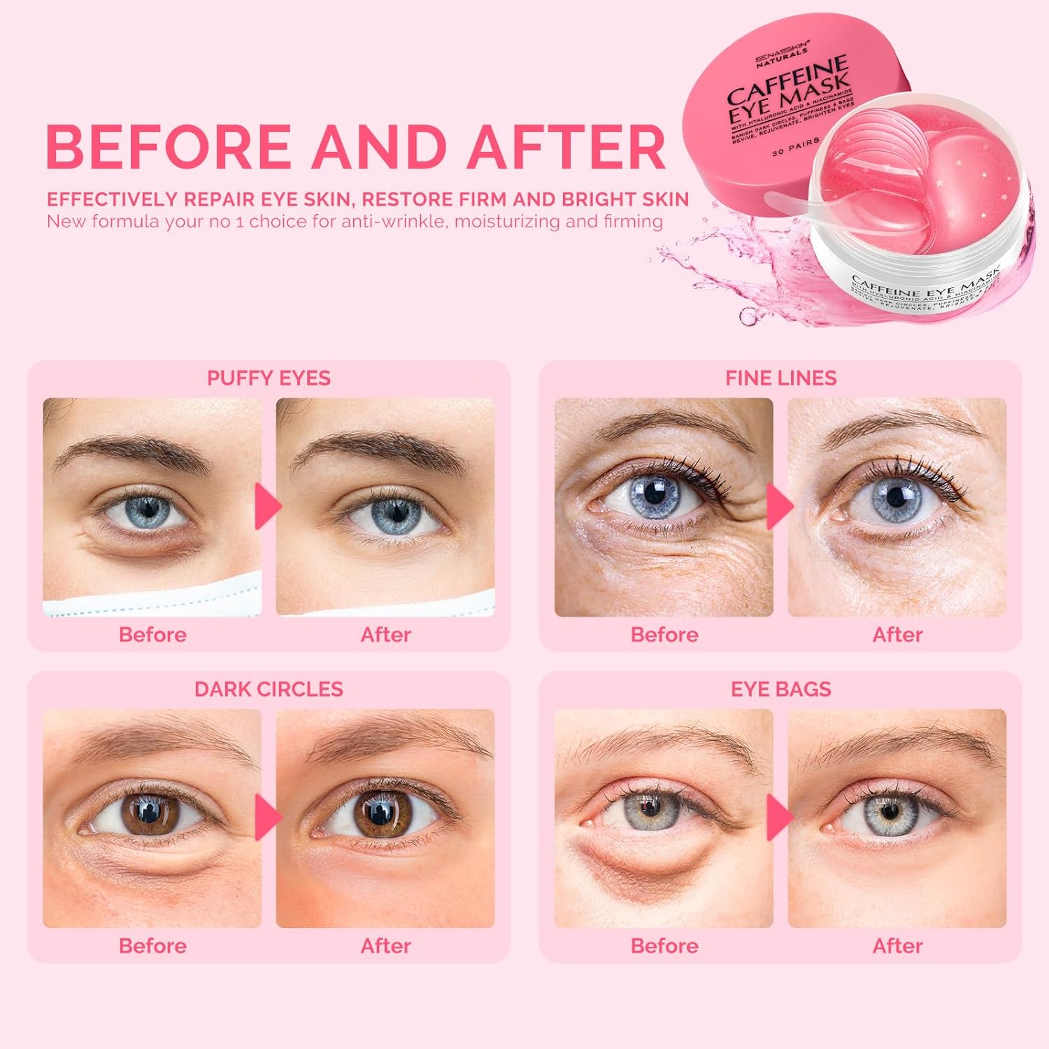 Enaskin Naturals Brightening Eye Masks: 30 Pairs Caffeine Under Eye Patches for Dark Circles and Puffiness w/Hyaluronic Acid - Skin Treatment Pads For Face Reduce Wrinkles & Bags (Rose)