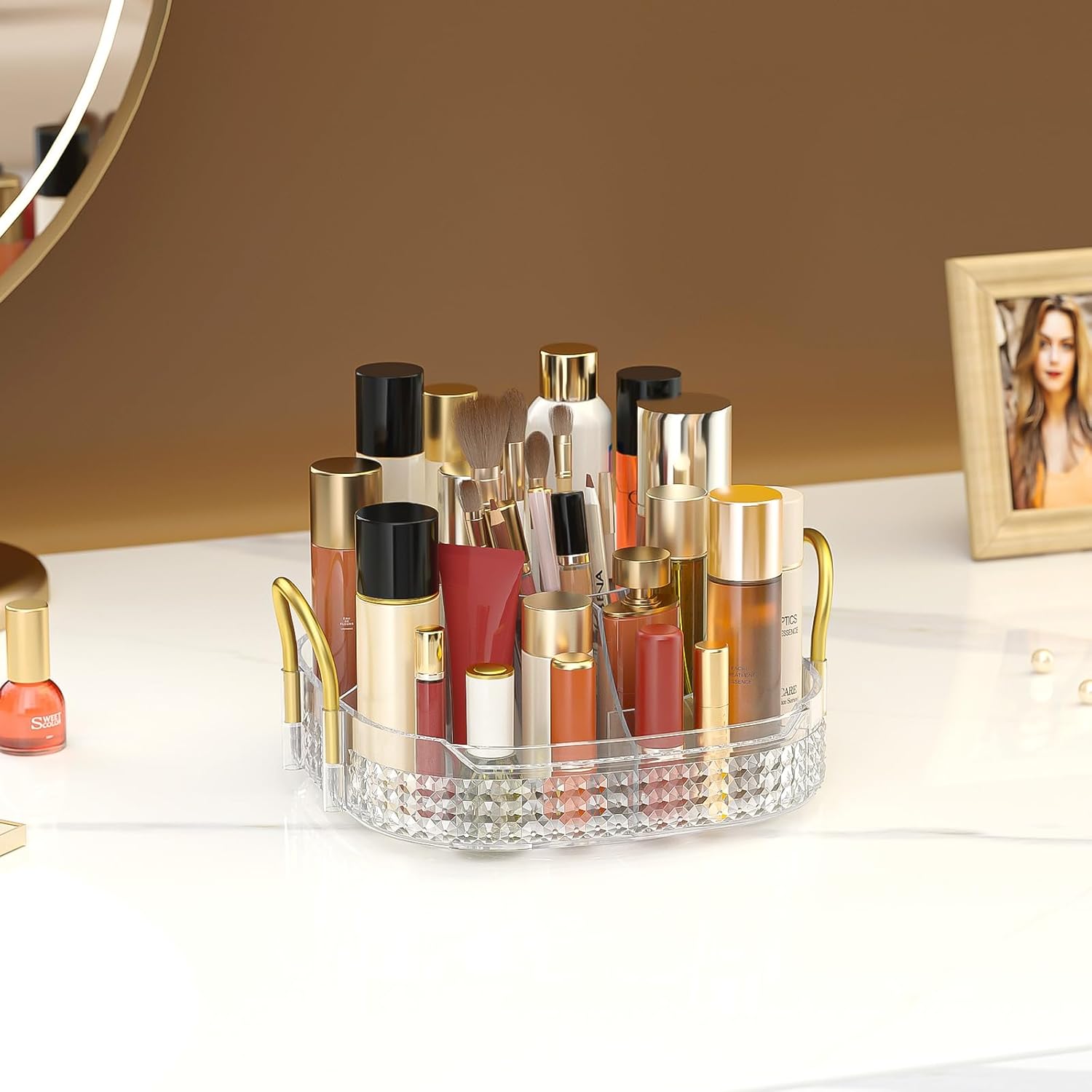 - Washable and Metal Stand:➤Awenia cosmetic organizer with clear acrylic material can be washed or wiped with a damp cloth,cleaned as good as new.Gold stainless steel stand and unique diamond pattern make the perfume organizer more strong,firm beautiful and easy to move. The 360 makeup organizer can be place in Dresser,Bathroom and Kitchen.