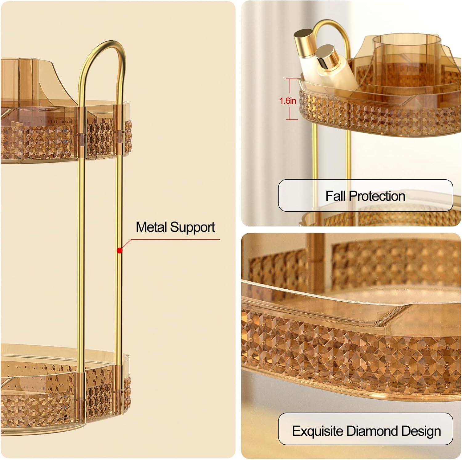 - Spinning Makeup Organizer: Rotate the perfume tray to find your desired item without worrying about cosmetics being thrown out, the rim height has been upgraded to 1.6 inches and the carousel is silky smooth and stable