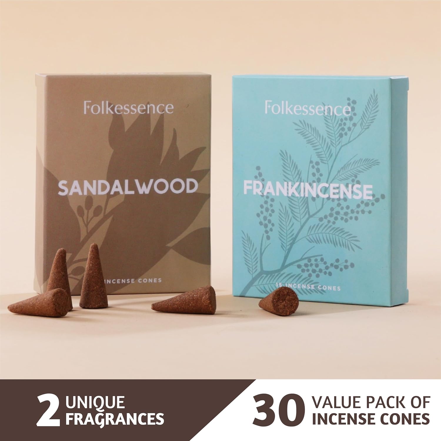 Folkulture Incense Cones Scented, Set of 2 Frankincense & Sandalwood Inscents-Cones (30 Cones), Variety Pack of Insence Cones for Relaxation, Aromatherapy & Air Purification