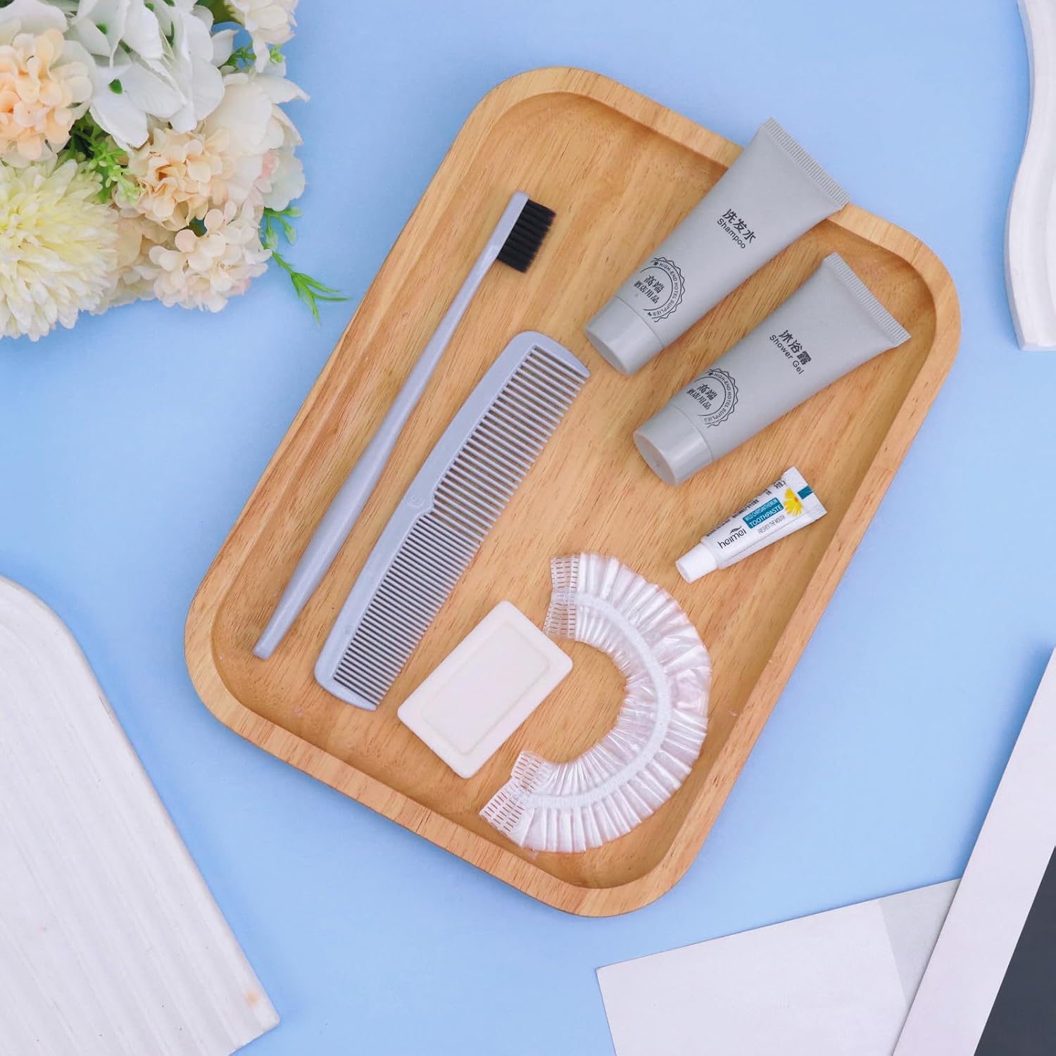 - More sets to match: our hygiene travel kit comes in a pack of 25 sets. Each travel size hygiene products bulk set consists of a Toothbrush, toothpaste, comb, bath gel, shampoo, soap and bath cap. 7 items in a set. personal care travel size toiletries make it even more comprehensive, convenient and comfortable to use.