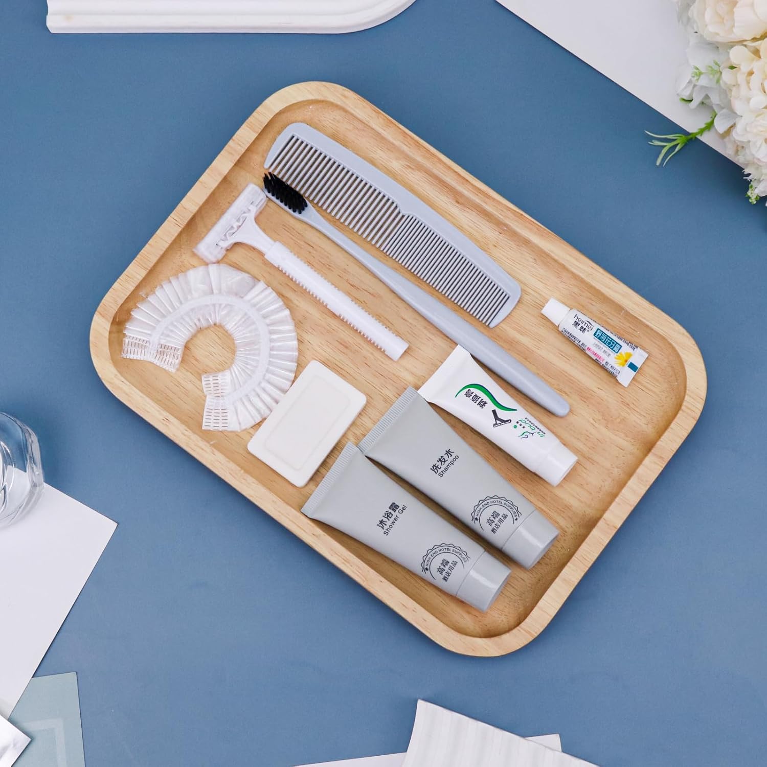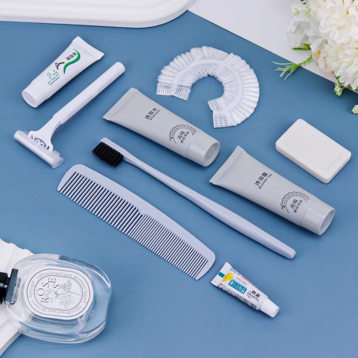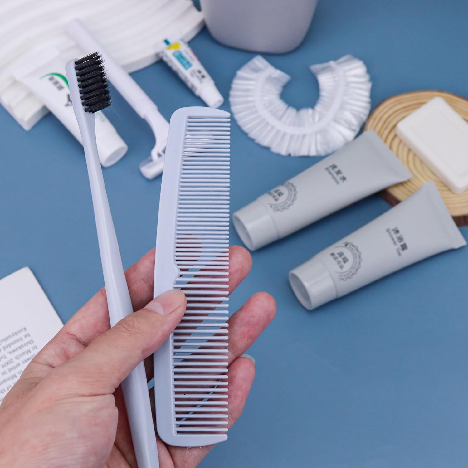 - More sets to match: our hygiene travel kit comes in a pack of 12 sets. Each travel size hygiene products bulk set consists of a Toothbrush, toothpaste, shaver, Shaving cream, comb, bath gel, shampoo, soap and bath cap. 9 items in a set. personal care travel size toiletries make it even more comprehensive, convenient and comfortable to use.