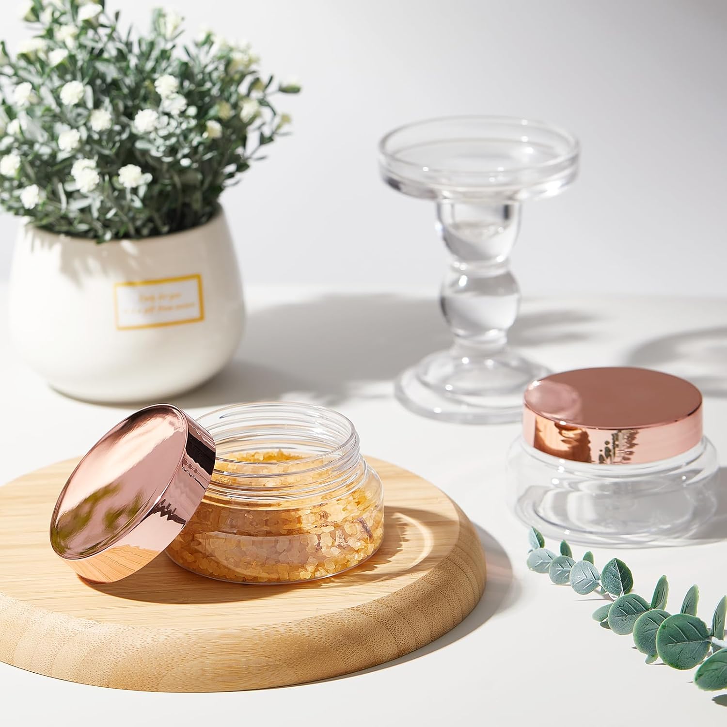 Tessco 24 Pack Plastic Jars with Lids Labels Empty Clear Plastic Jars Round Refillable Cosmetic Containers Body Butter Containers Bulk Sugar Scrub Bottle for Make Up(5 oz,Clear, Rose Gold)