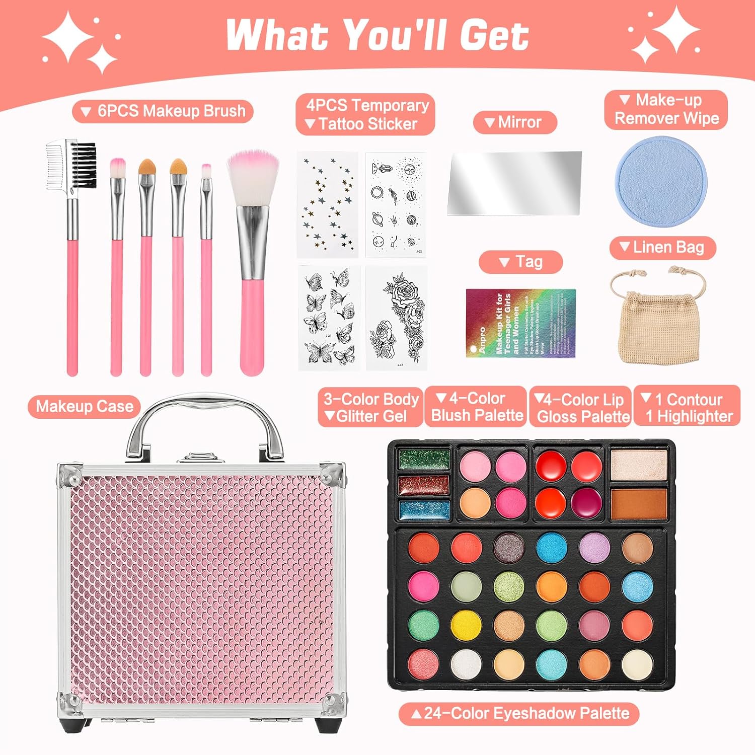 - Pro Teen Makeup Kit: This kit includes a 24-color eyeshadow palette, 4-color lip gloss palette, 4-color blush palette, 3-color body glitter gel, highlighter, contour, 4 temporary tattoo stickers, makeup remover wipe with linen bag, 6 makeup brushes, mirror, and tag, all neatly packed in a stylish case.