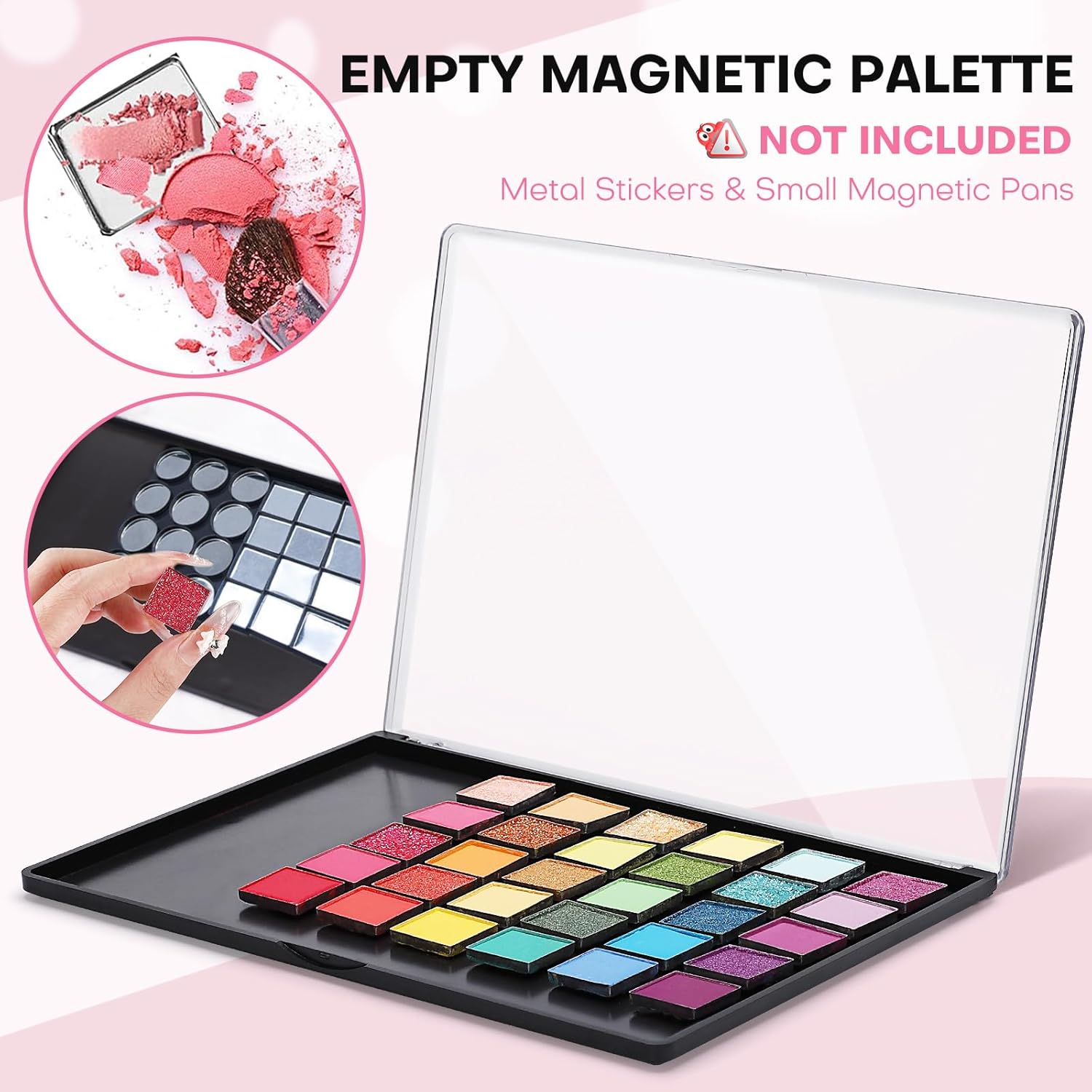 - 【A Match Made in Makeup Heaven】-- These solidly constructed palettes feature an open magnetic interior. Encased by a clear lid to prevent water and dust, and allows you to see all of your shades at a glance! The palettes are reuse-able and easy to clean. Perfect for replacing your favorite shades or trying new ones. (NOTE: NOT INCLUDED Metal Stickers & Small Magnetic Pans.)