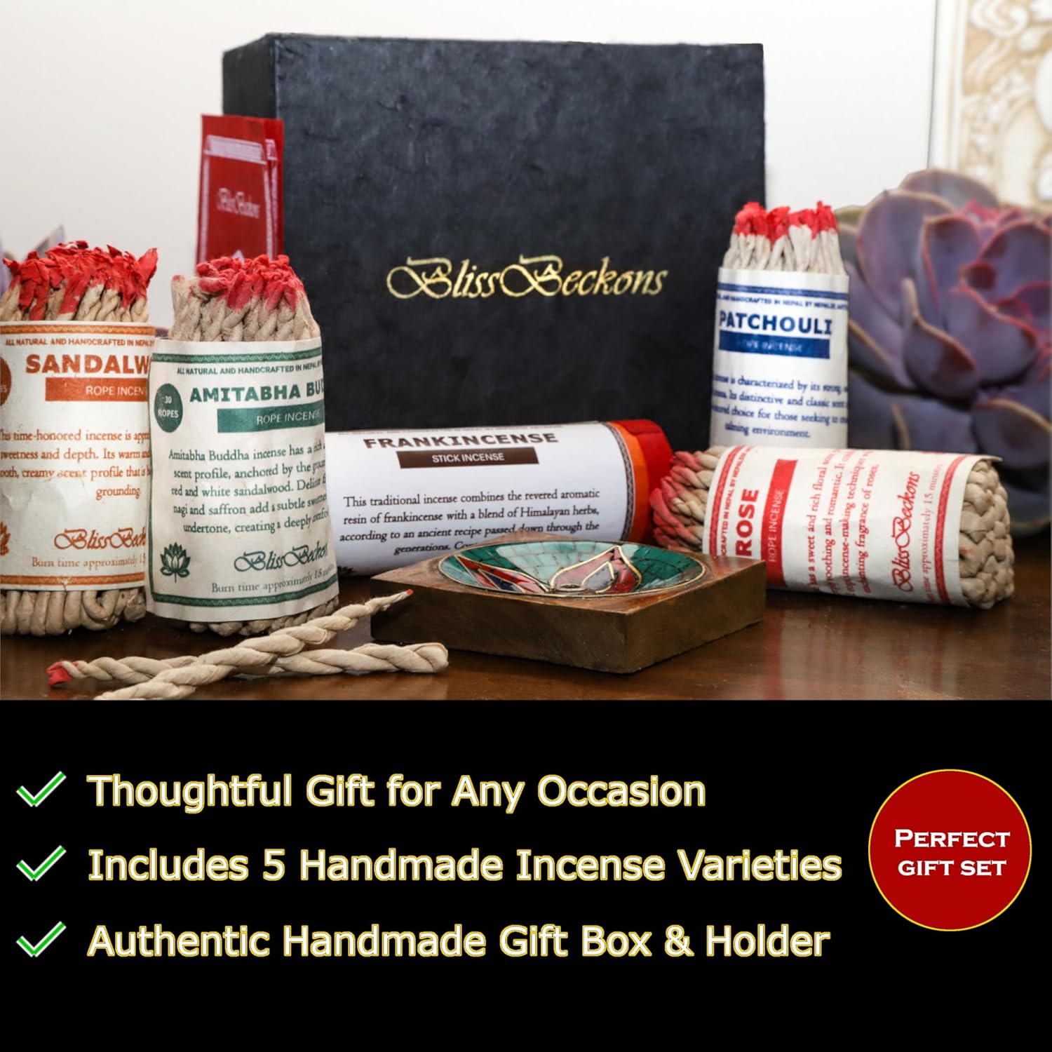 - GIFT SET CONTENTS - 1 - 30 piece bundle of handcrafted Frankincense stick incense, 4 - 30 piece handcrafted rope incense bundles (Patchouli, Rose, Amitabha Buddha, Sandalwood), and a handcrafted incense holder in a gift-ready lotka box