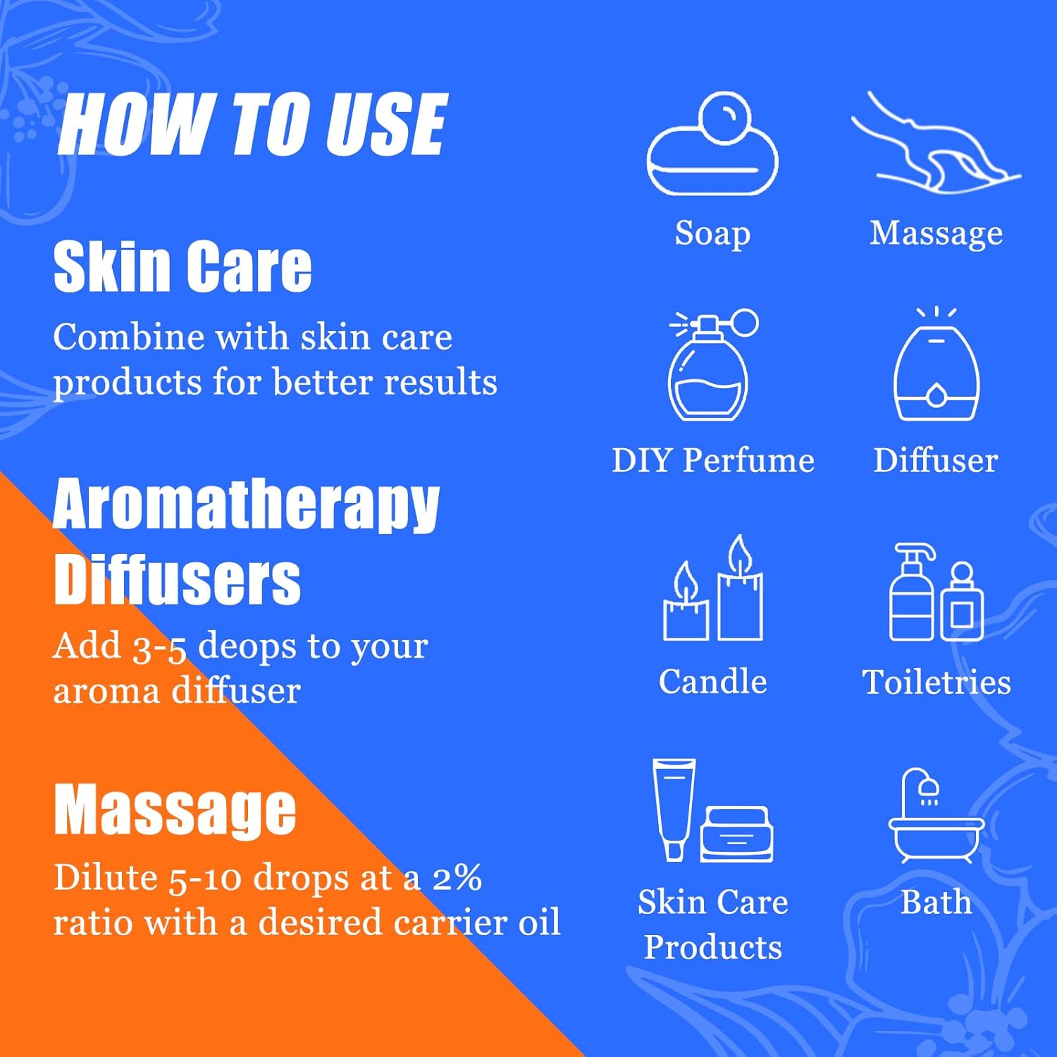 - EVERYDAY ESSENTIAL OILS:Our home diffuser essential oils can be used in humidifiers, clothing scenting, soap making, candle making, skin care, bath and hair care, phytotherapy, massage, and many more DIY creations!