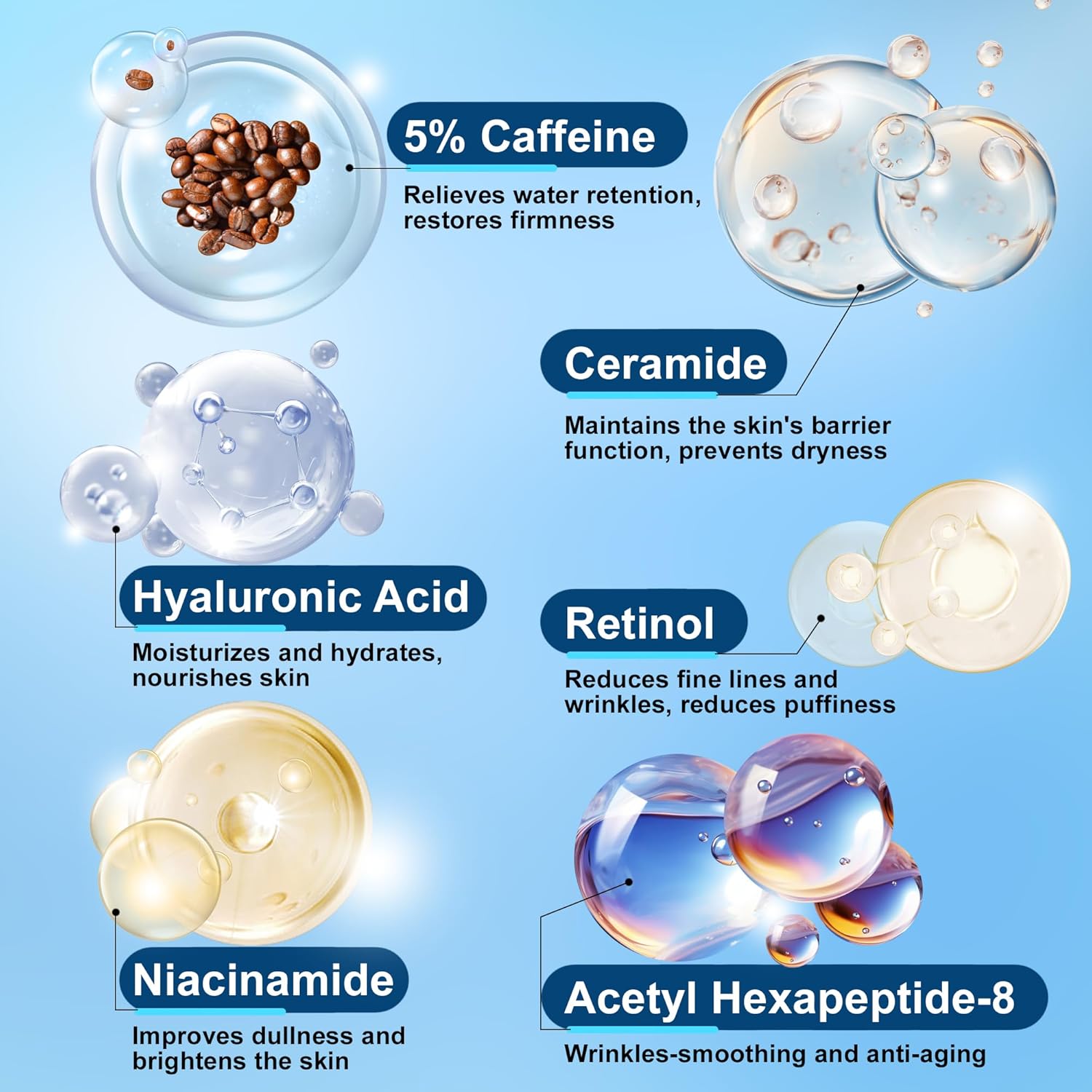 - Firm and Lifting: This eye serum effectively reduces eye bags, sagging and crepey texture, tightens the droopy eyelids, minimizes wrinkles and fine lines, serving as a quick fix for dates, parties, special events and photo sessions, particularly beneficial for mature individuals and frequent makeup users.