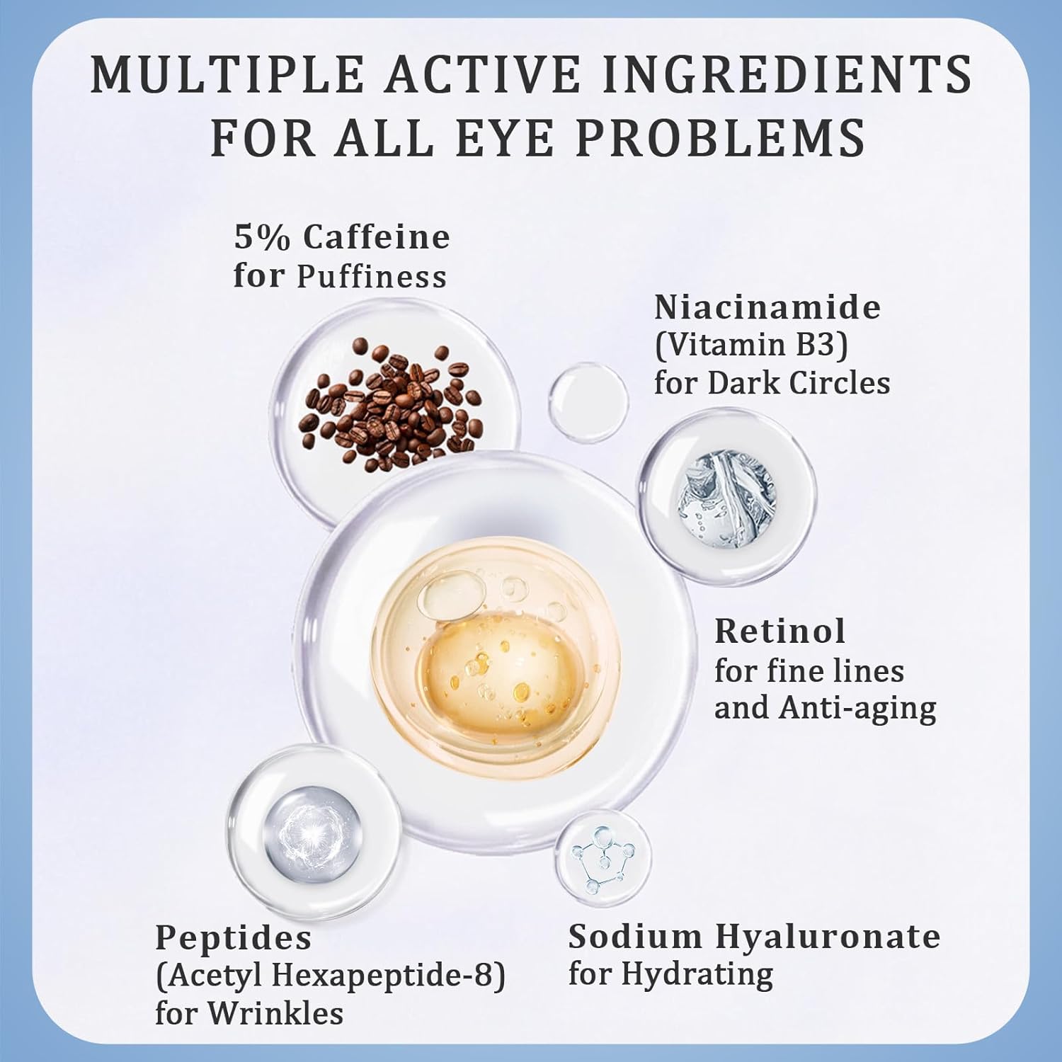 Under Eye Cream with 5% Caffeine, Dark Circles Under Eye Treatment with Retinol, Anti Aging Eye Serum with 360° Massage Roller for Eye Bags, Wrinkles and Puffiness, 0.5 fl. oz,3 Pack