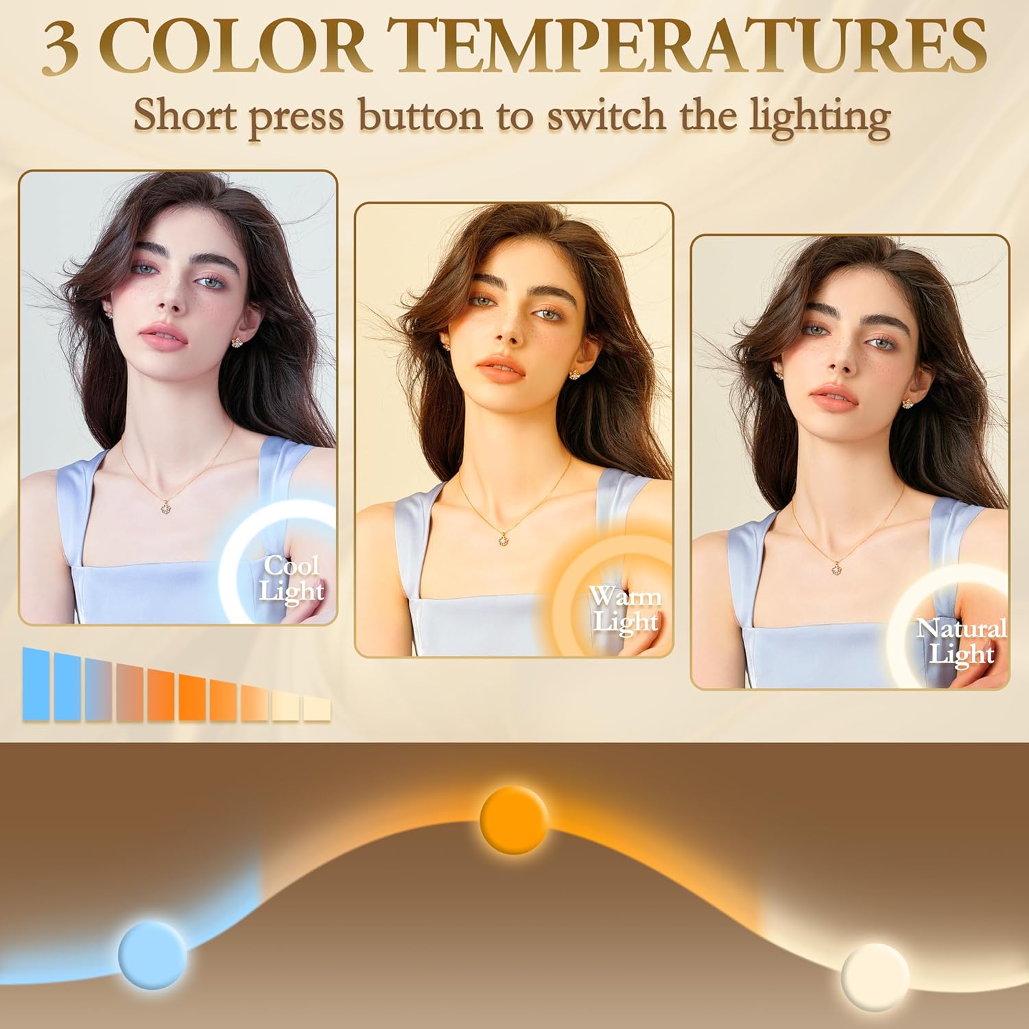 - SMART DIMMING】This vanity mirror is equipped with three different color temperature settings and adjustable brightness settings. You can choose between warm, cool, or natural light depending on your preference and the occasion. The brightness can also be adjusted to your desired level, allowing you to apply makeup or do your skincare routine with ease, regardless of the lighting conditions in your room.