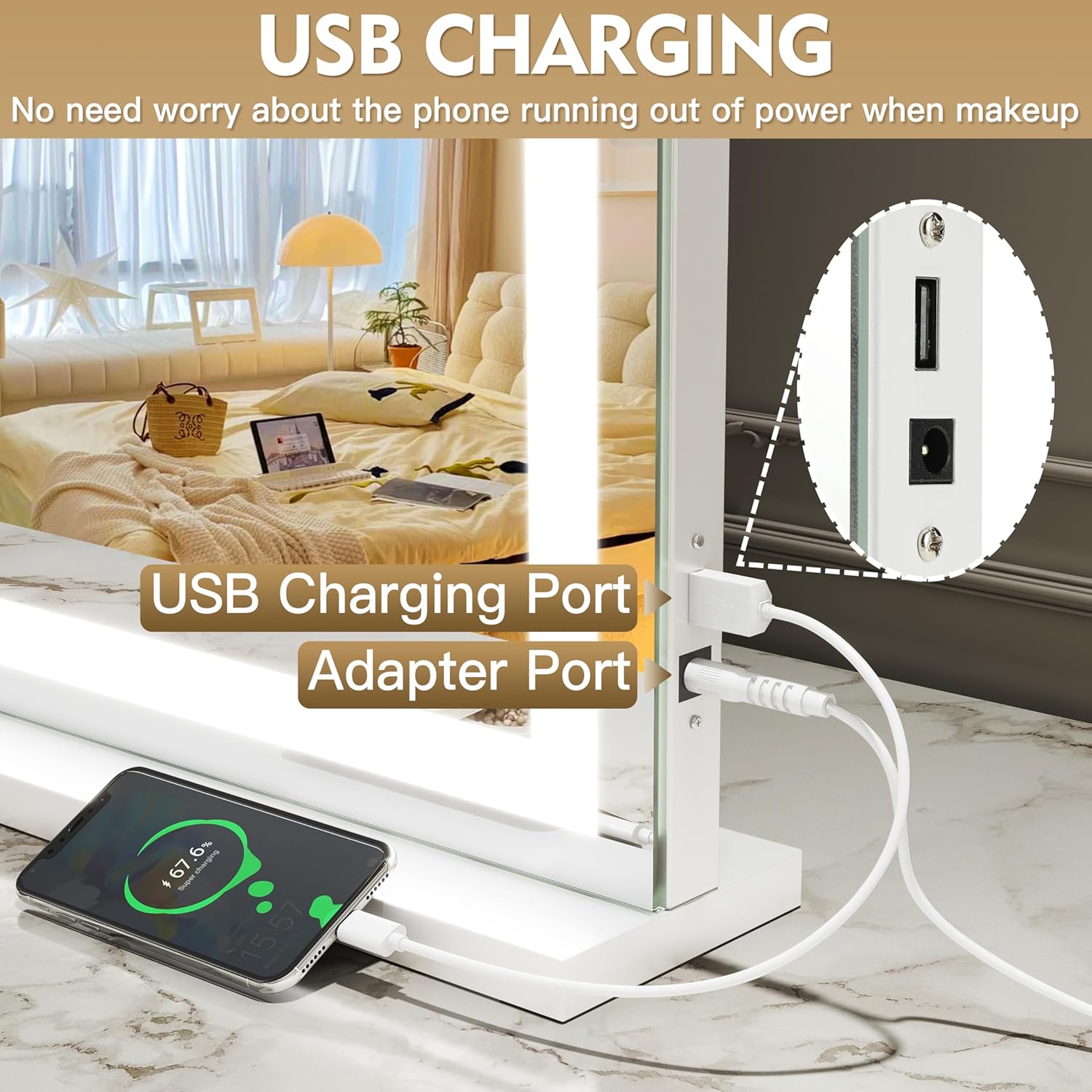 - 【USB CHARGE PORT】 The right side of the vanity mirror is equipped with USB charging ports, which can charge your smartphone, computer or other USB devices, giving you a different and convenient experience.