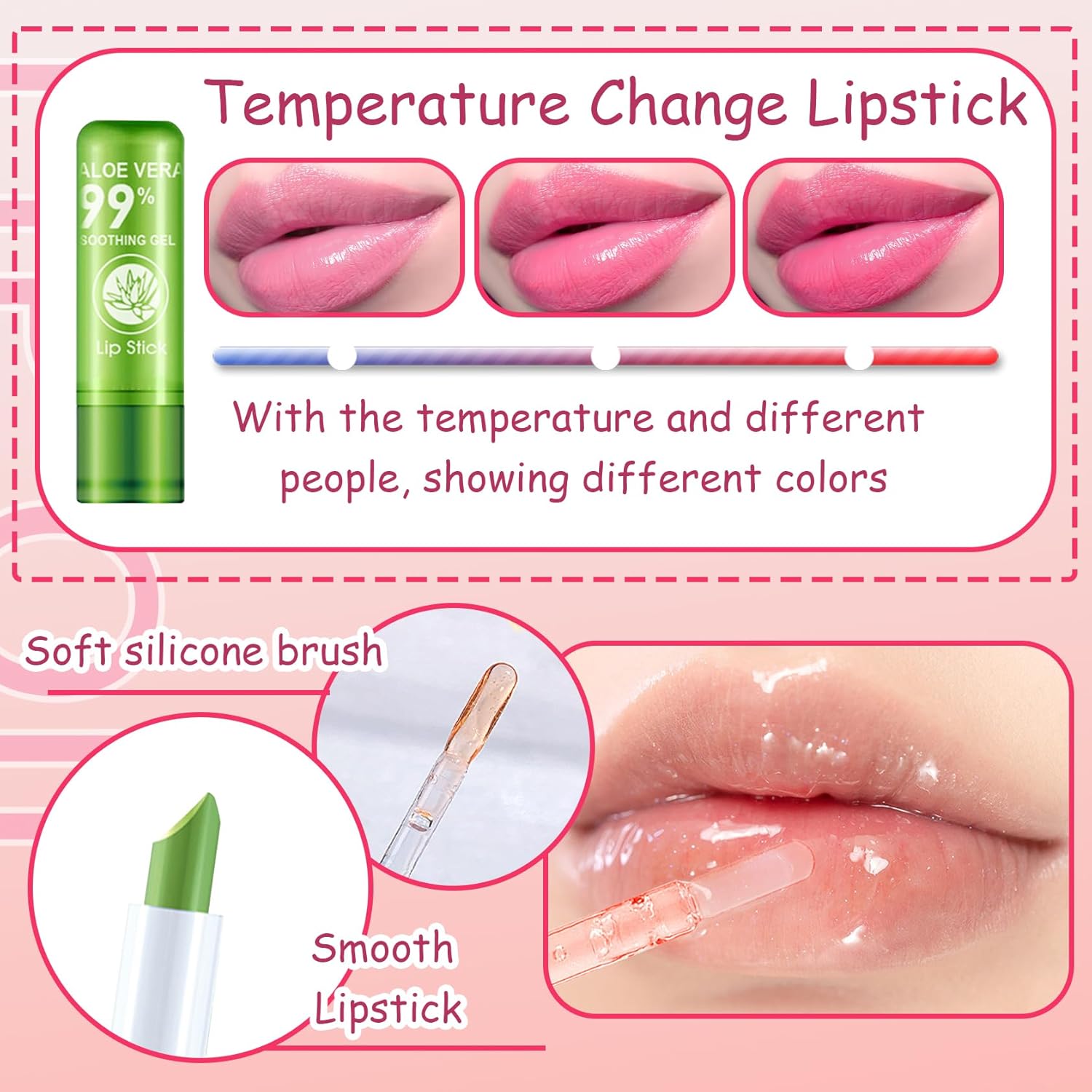 - Color Changing Lipstick:The magical aloe vera lipstick will change colour according to the temperature of your lips, giving you a unique and beautiful lip make-up, with a natural and beautiful finish, perfect for everyday lip make-up, casual, party and office use