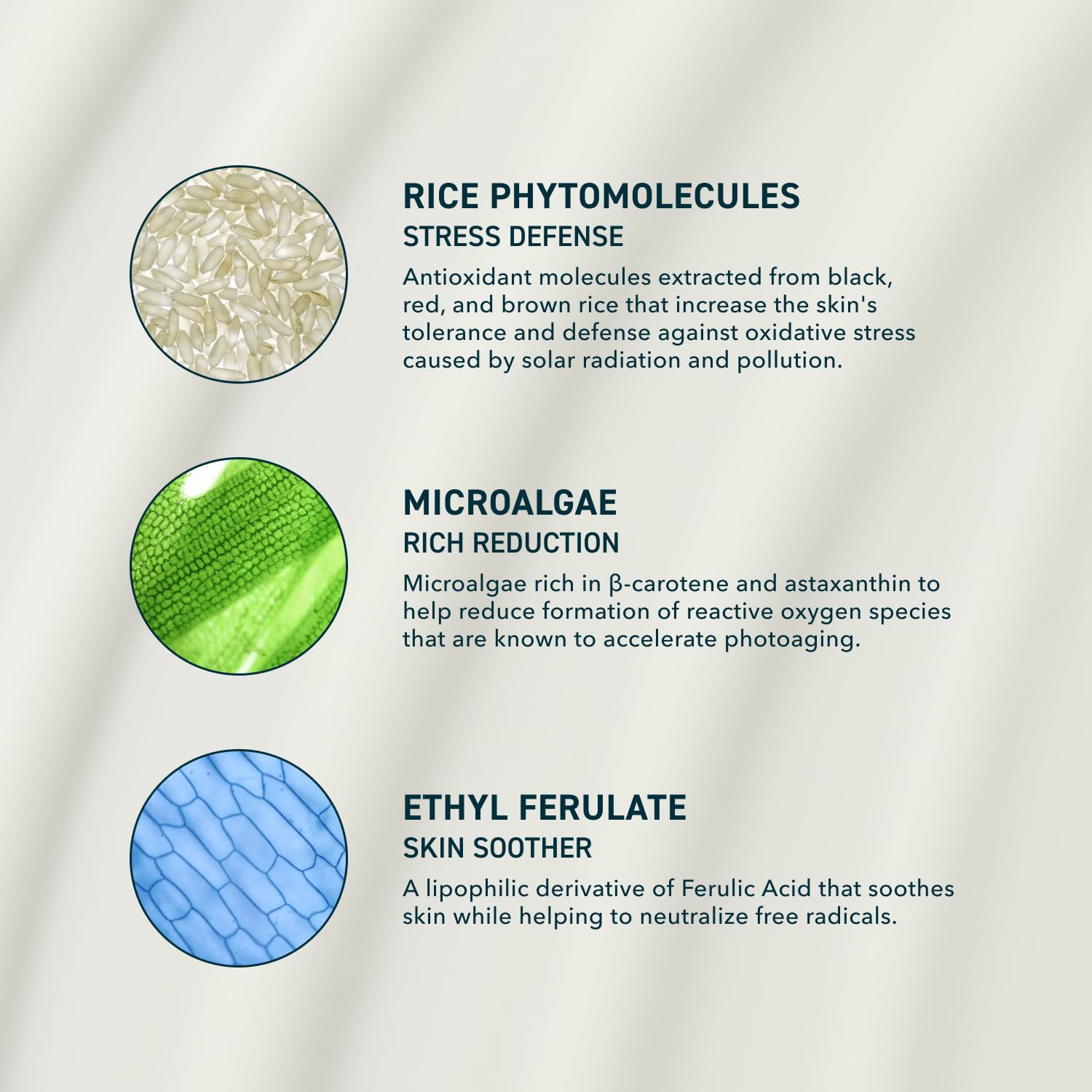 - ANTIOXIDANT SUPPORT: Rice phytomolecules boost skin resilience to UV and environmental stressors, while Microalgae, rich in β-carotene and astaxanthin, support visible skin improvements caused by photoaging. Ethyl Ferulate soothes while targeting impurities for healthier-looking skin