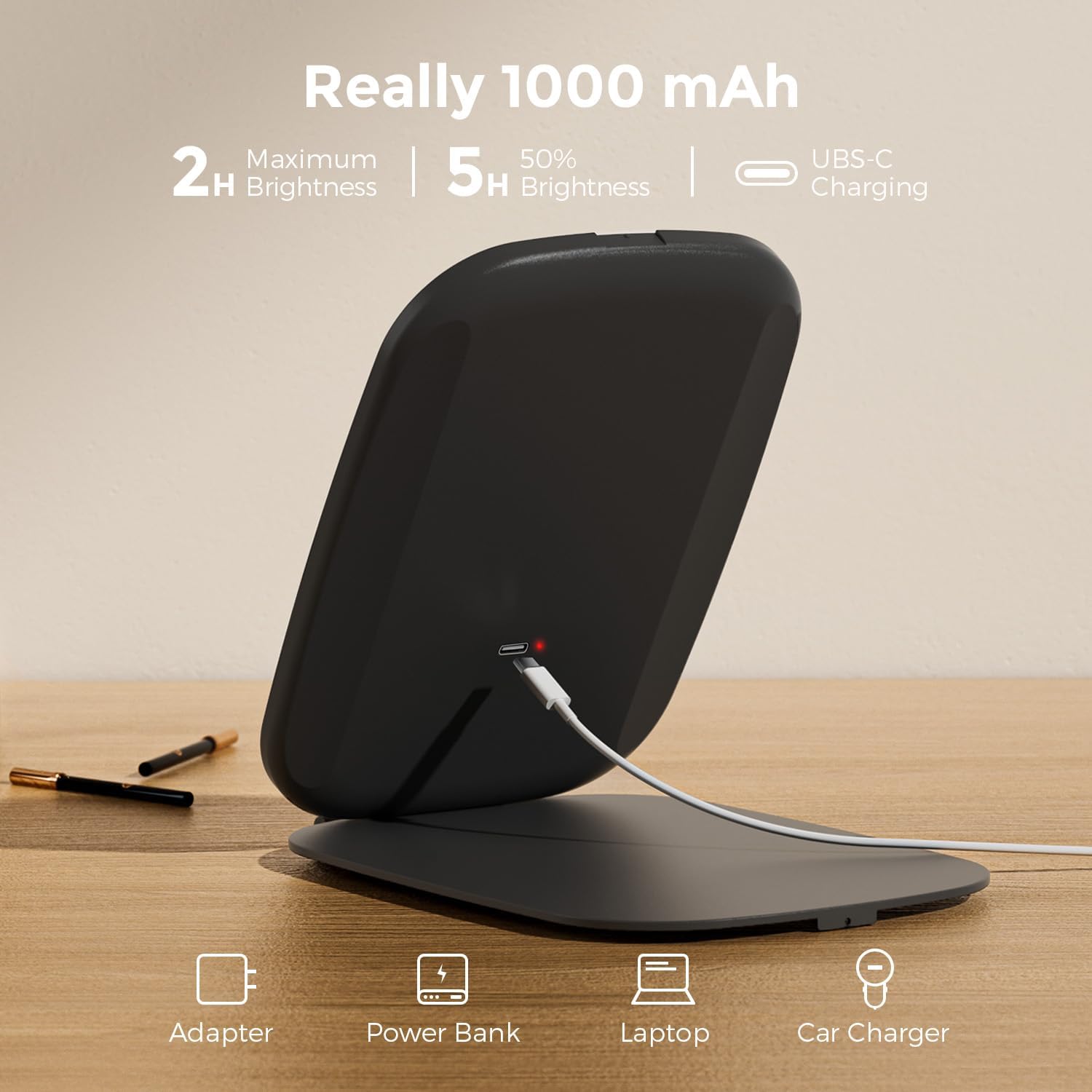 - USB C rechargeable portable makeup mirror, built-in sufficient 1000mAh lithium battery, can provide more than 2 hours of working time, no need to replace the battery or frequent charging