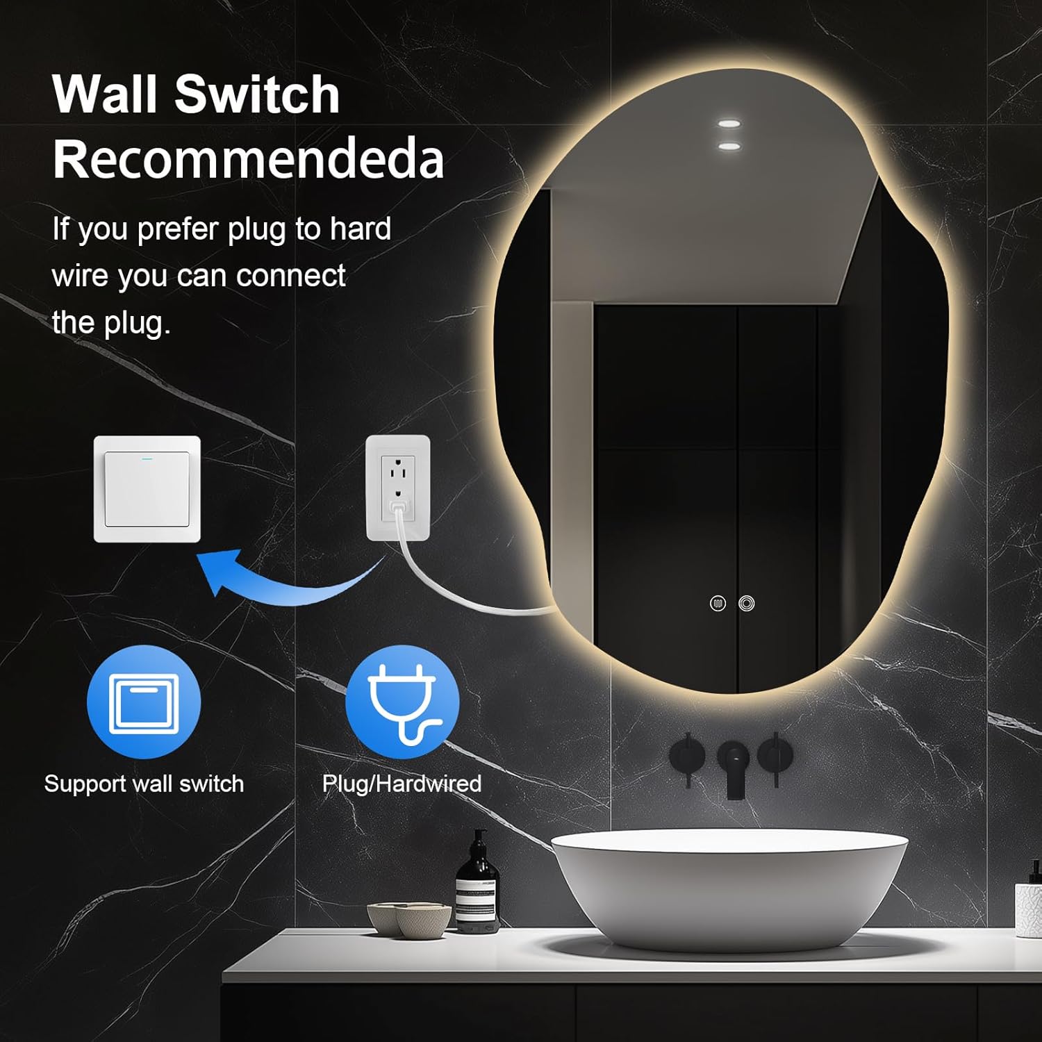 - Long-lasting & Easy Installation: With a lifespan of over 50,000 hours, this high-quality LED bathroom mirror is UL-certified and easy to install, supporting both wall switch control and plug/hardwiring options.