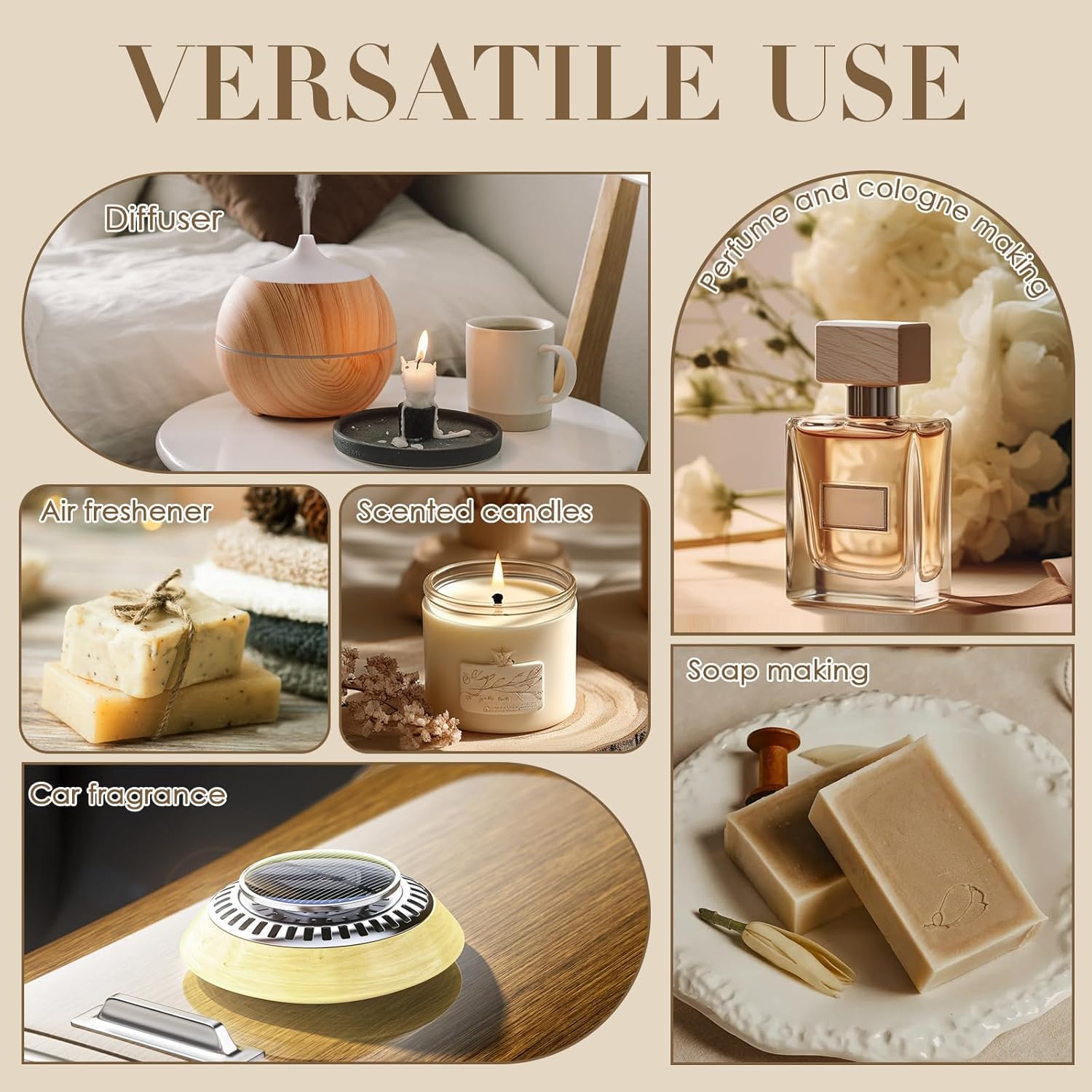 - Versatile Use: Perfect as oil scents for diffuser, candle scents for candle making, soap making supplies, or used in car air freshener, slime scents, oils for laundry, our fragrance oils also work well in many essential DIYs such as bath salt, body lotion, hair oil, perfumes. Whether you are in your home, office or car, these fragrance oils will bring you a fresh and pleasant experience.