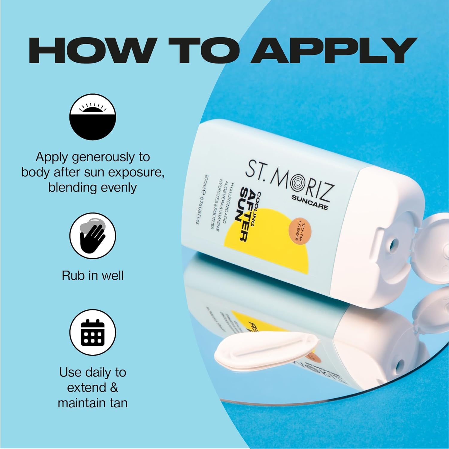 - INTENSELY HYDRATES & COOLS SKIN AFTER SUN: The St. Moriz Suncare Cooling After Sun lotion is fast absorbing & deeply nourishes the skin after sun exposure. Infused with Hyaluronic Acid, Aloe Vera & barrier strengthening Vitamin E to soothe & moisturise.